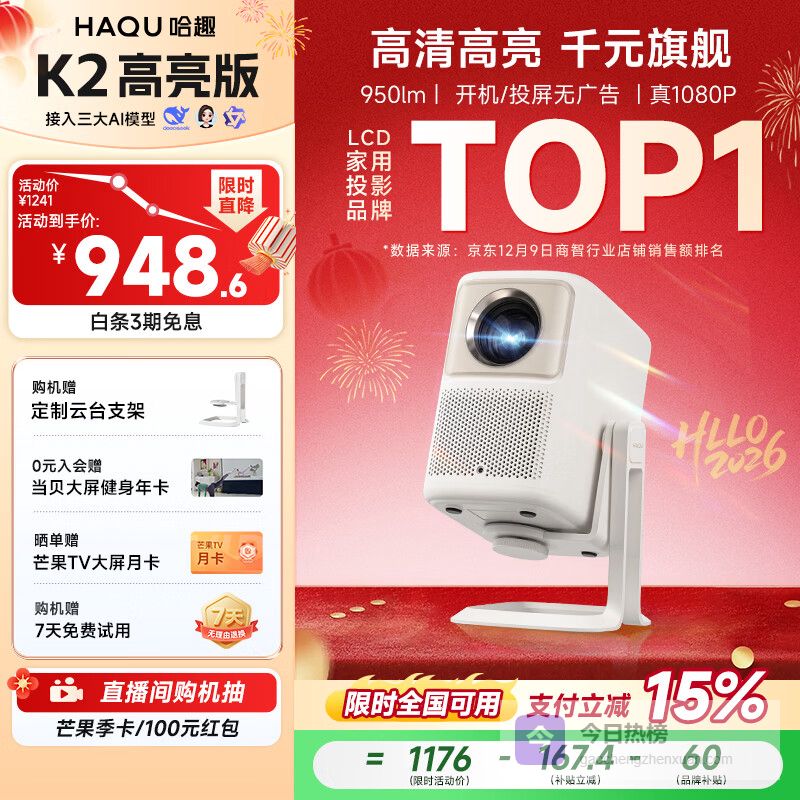 哈趣K2 高亮版 云台投影仪 家用便携 1080P高清 家庭影院 卧室游戏宿舍投影仪 国家补贴 亮度升级¥