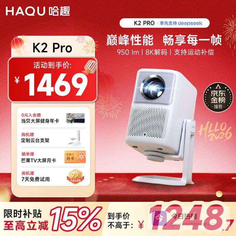 哈趣K2 Pro高亮版 投影仪家用 高清智能便携卧室客厅投影仪(950 lm高亮 8K解码 运动补偿)¥
