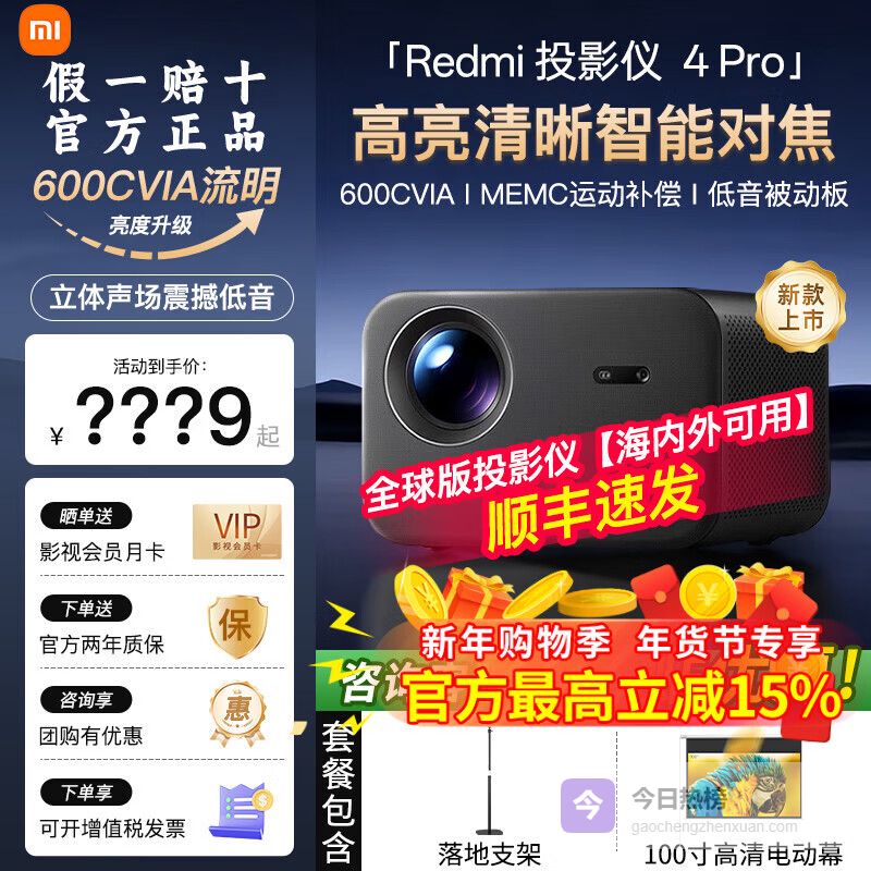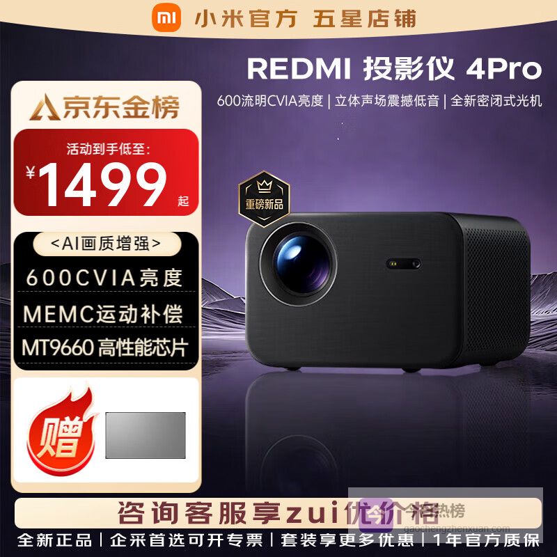 小米Redmi投影仪4 Pro家用护眼高清投屏客厅卧室智能家庭影全球海外版 单机+落地支架+100寸高清电动幕¥