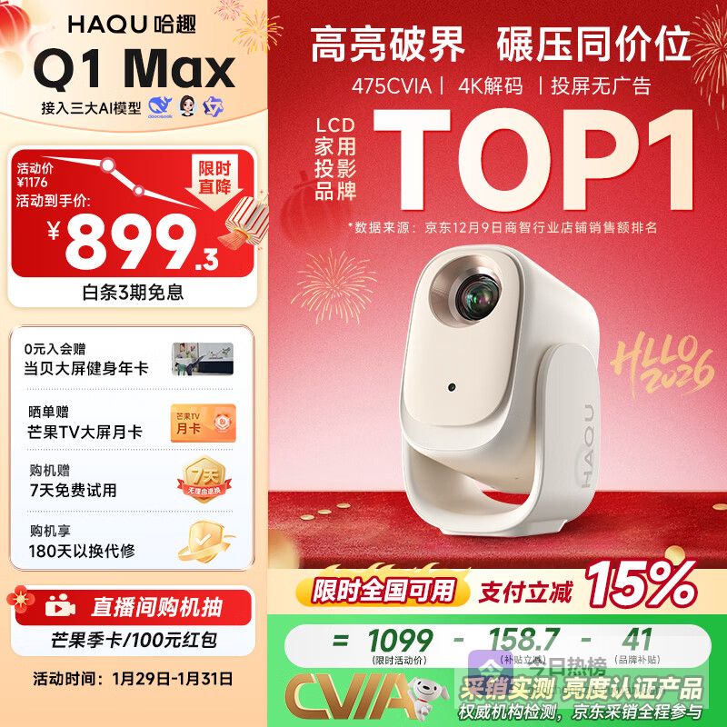 哈趣Q1 Max 投影仪家用 家庭影院 真1080P高清 智能便携卧室宿舍投影机(万元电视级芯片)¥