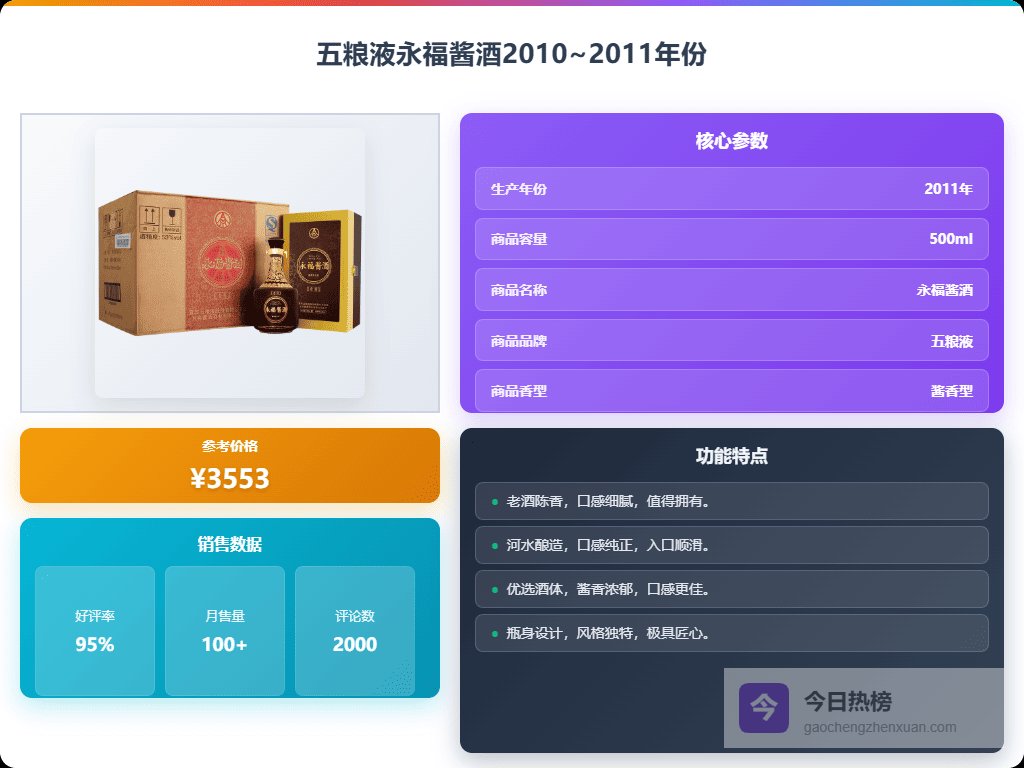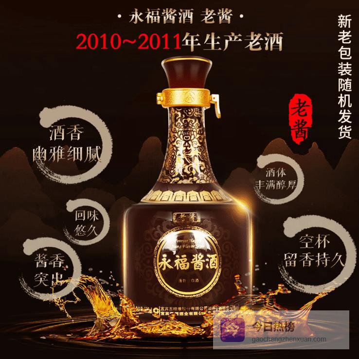 五、五粮液【陈年醇香】经过多年陈放,五粮液永福酱酒2010~2011年份的香气更显幽雅细腻,酱香突出,入口更为醇厚丰满。长时间的存放让酒中的风味物质融合得更加完美,喝起来顺滑细腻,不辛辣,余味悠长,非常适合喜欢细品慢饮的朋友。