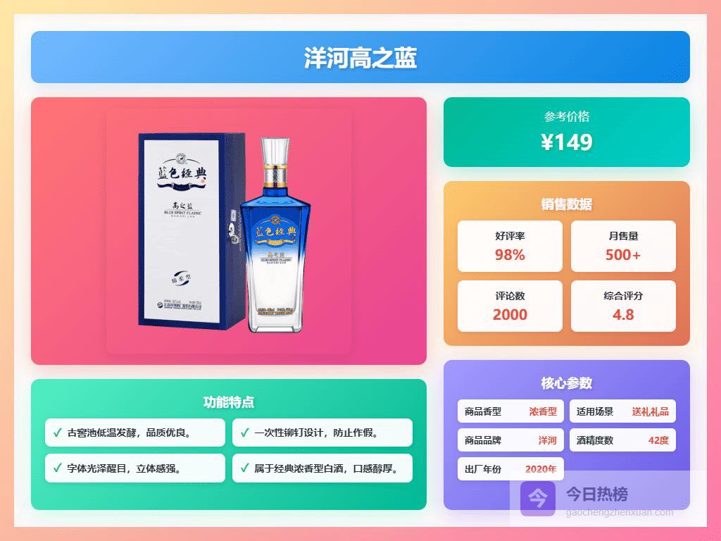 八、洋河【浓香口感】洋河高之蓝属于浓香型白酒,香气幽雅怡人,入口后能体验到绵柔顺喉的感觉,非常适合喜欢浓香的朋友。无论是自己喝还是用作送礼,都能彰显品质和品味。