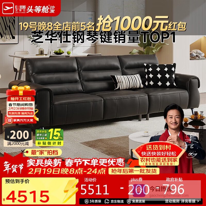 芝华仕(CHEERS)现代简约真皮沙发客厅2025新款大黑牛钢琴键芝华士3175黑2.08m¥