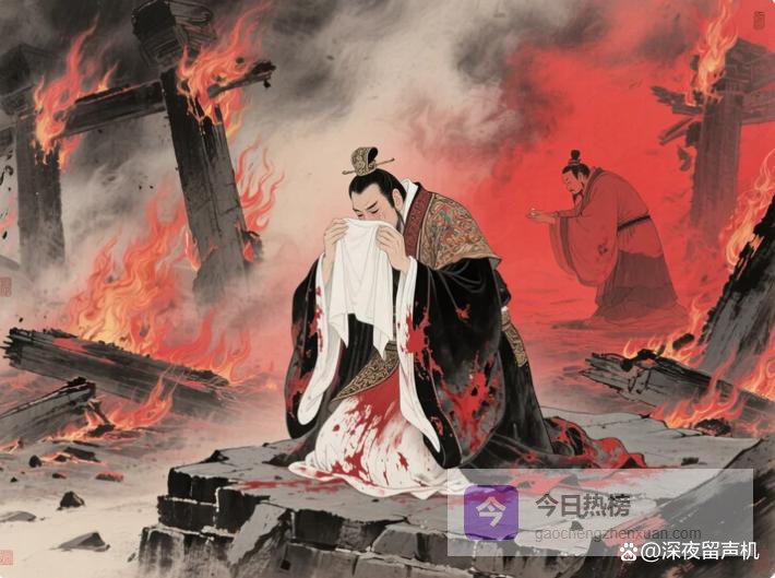 夫差跪在废墟之中,用布蒙住自己的脸,拔剑自刎。