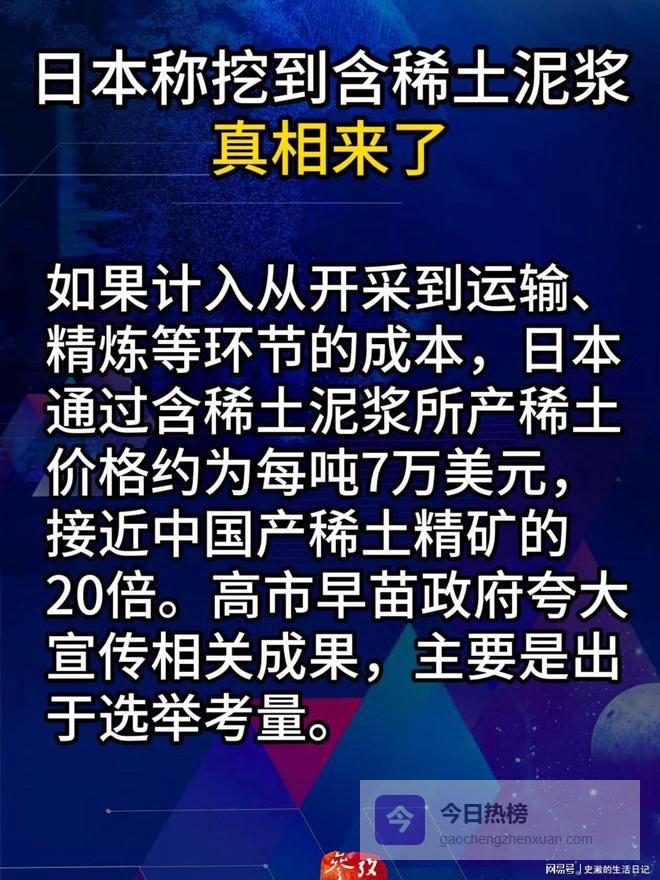 报道说,南岛海底稀土,成本被预估为每吨7万美元,更搞笑的是,不少日本网民认为即便这么贵,为了摆脱对中国的依赖,也应该去开采,毕竟是日本的“爱国稀土”,说不定技术上去了,价格就降下来了呢?