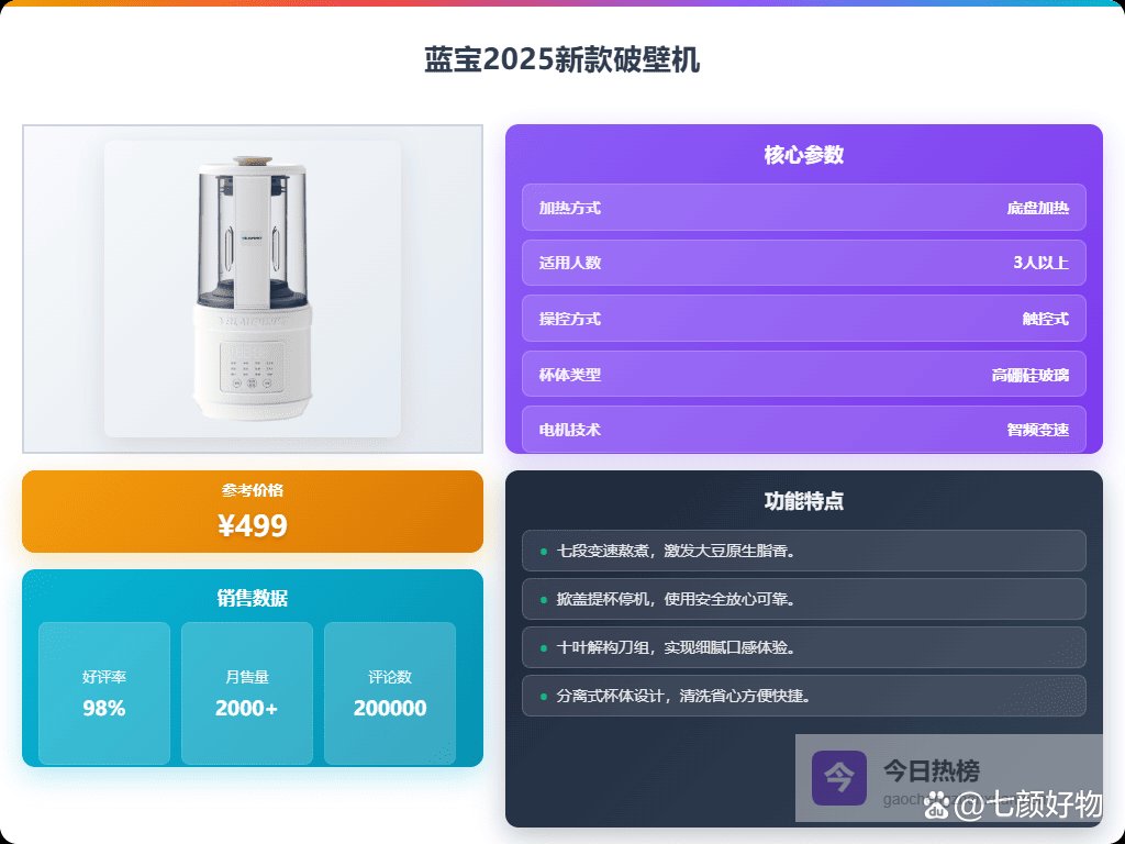 总结: 面对琳琅满目的破壁机市场,小米米家和蓝宝绝对是绕不开的两个品牌。它们各有千秋,在性价比、智能化、静音效果等方面都有着不同的侧重。如果你追求极致性价比,同时对于破壁机的功能需求比较基础,那么蓝宝的许多型号,如蓝宝2026新款破壁机,会是不错的选择,它能满足日常豆浆、米糊等需求,价格也更亲民。而如果你是智能家居的爱好者,或是对降噪有较高要求,那么小米米家的产品,像是米家智能轻音破壁机S2,可能会更符合你的心意,它在智能化和静音方面表现出色,让你在享受美食的同时也能拥有安静的环境。当然,具体型号的选择还需结合你的实际需求,比如对杯体材质、加热方式、清洗方式等方面的偏好。 蓝宝柔音主打静音和蒸汽加热,而米家智能轻音破壁机S2同样在降噪上下足了功夫,还加入了智能互联。像是蓝宝PB02 PRO,它具备23道扰流柱设计和10叶三层鲨齿刀,能实现旋风式搅拌和细腻的口感,以及高温自清洗功能,非常适合家庭日常使用。总之,在选购破壁机时,多做功课,根据自身情况仔细对比,才能找到真正适合自己的那一款。