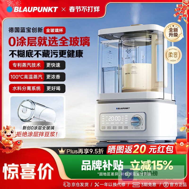 蓝宝(BLAUPUNKT)【0涂层全玻璃】柔音蒸汽破壁机家用豆浆机全自动免煮婴儿辅食榨汁机低音降噪预约早餐机政府补贴¥