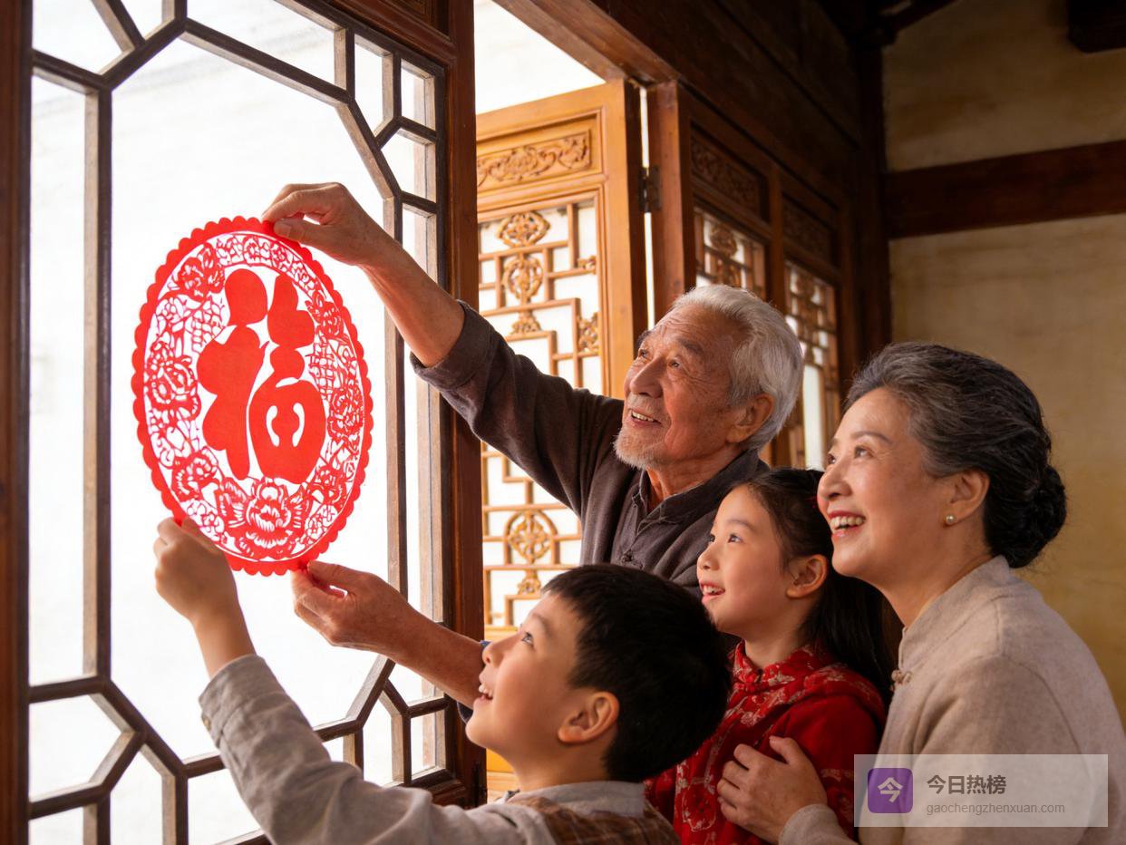 “窗花贴处笑声喧”一转,空间顿生暖意。红纸剪就的“福”字或“春”字贴上窗棂,冰冷的玻璃突然有了温度。孩子的笑闹撞碎了冬日的沉寂,大人的低语混着糨糊的甜香,家务不再是苦役,而成了家庭仪式的彩排。窗花是门笺,也是心笺,将外界的寒风挡在窗外,把团圆的热望贴在心里。