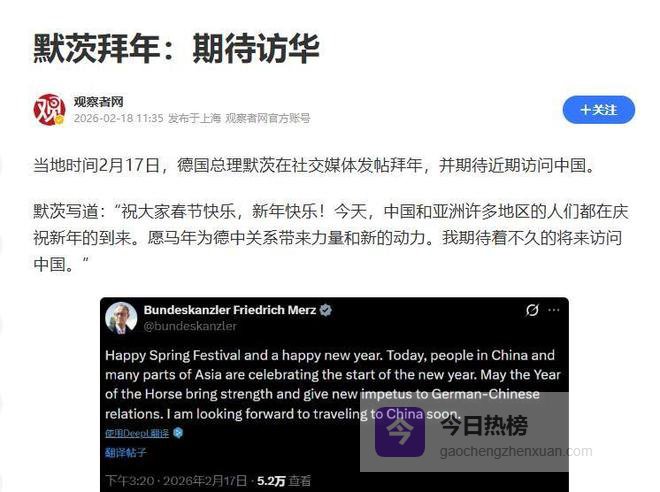 就在对美表态的同时,默茨确认将于2月24日至27日访问中国。