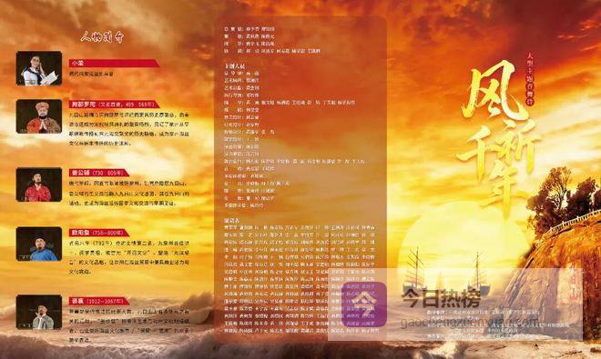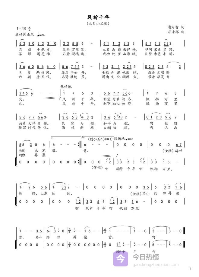 作为该剧的点睛之笔,九日山主题歌《风祈千年》在现场实现“首唱”。歌曲由十五次登上央视春晚舞台的著名女高音歌唱家吕薇倾情演唱,原海政文工团创作室主任、经典作品《数鸭子》曲作者胡小环谱曲,南安本土作家谢万智作词。