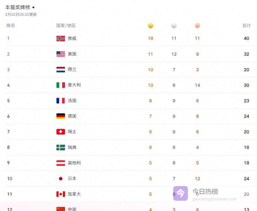 中国冬奥奖牌创新高和挪威代表团相比,中国这次冬奥会的竞争力确实不太强。一直到第12个比赛日,咱们才终于打破金牌荒。现在中国代表团已经拿了4块金牌、3块银牌、6块铜牌,总共13枚奖牌,暂时排在奖牌榜的第12位,基本上是没希望进前十了。不过,这次的成绩还是创下了中国在境外举办冬奥会的奖牌数新高。