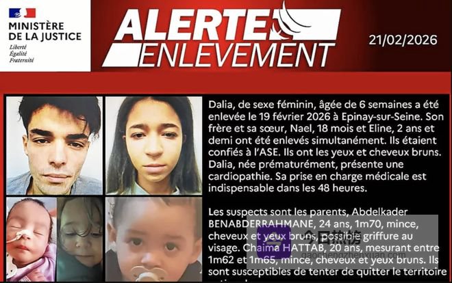 巴黎2月21日(鲁佳)21日本周六,法国司法部发布绑架警报,称巴黎大区塞纳-圣但尼省(Seine-Saint-Denis,93省)三名儿童失踪,包括年仅六个星期的达莉亚(Dalia),以及她的哥哥和姐姐——18个月大的纳埃尔(Nael)和2岁半的埃琳(Eline)。他们的父母是嫌疑人。