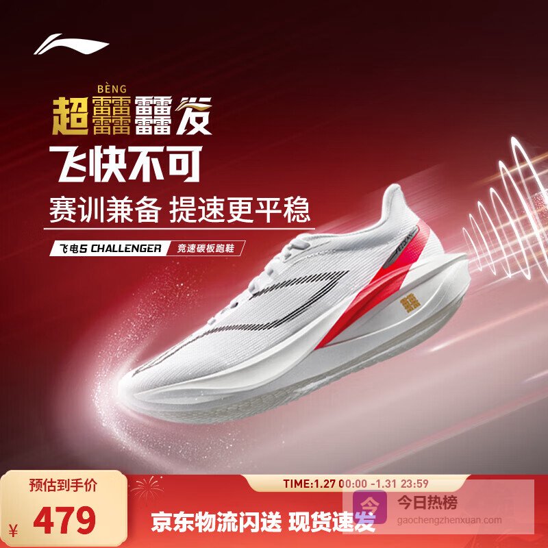 飞电5 Challenger是大众碳板的天花板,堪称李宁的诚意之作,549-800元的价格,让普通跑者也能轻松体验碳板的快乐。最速曲线系统搭配T700级铲形碳板,滚动感澎湃又不挑脚法,半马150或全马400以内的跑者穿它完全够用,中底的超䨻科技让回弹也很在线。GCR大底的湿地防滑和耐磨性都不错,日常赛训都能hold住,不用再花大价钱买高端碳板鞋,飞电5 Challenger这双鞋就是大众跑者的碳板入门首选,也是跑圈里的“平民碳板神鞋”。
