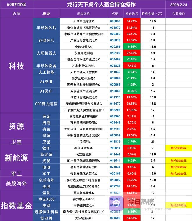 有色稀土资源 有色资源今天上涨是因为春节期间黄金涨的不错,趋势上大龙继续长期看涨不变,大龙先卧倒不动为主。黄金白银 黄金今天大涨3.5%,大龙继续持有等涨,但不追涨,后续还是继续看涨到4200美元的。半导体芯片计算机算力科技 半导体芯片目前继续等待上涨。人工智能软件AI应用 AI应用软件大龙并不看好,虽然是在低位了,但还是弱势,大龙暂时观望不加。CPO通信 CPO通信大龙继续看涨到3月底 新能源车光伏、固态电池、储能 新能源光伏做短期反弹为主,短期行情不大,大龙先等待上涨。锂矿 锂矿大龙继续拿好等涨了。机器人 春节一堆利好但机器人还是下跌,太一致了,大龙先观望。白酒消费 白酒大龙不看好,大龙不玩媒动漫游戏 传媒动漫大龙暂时观望不动,大龙暂无持仓。