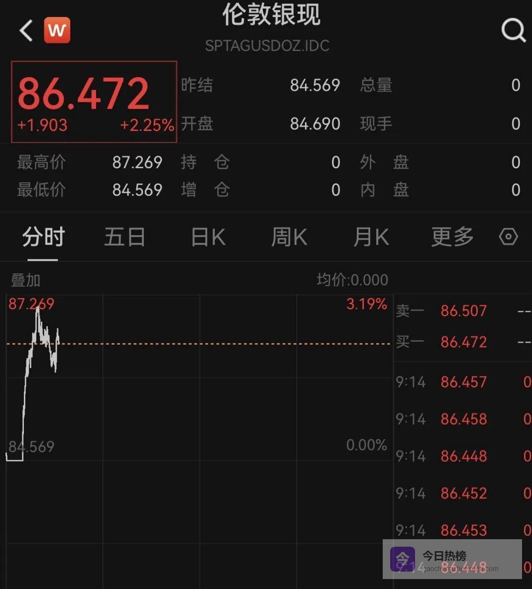 截至北京时间2026年2月23日7时50分,现货黄金报5157.72美元/盎司,日内涨幅0.91%。伦敦现货白银报86.673美元/盎司,日内大涨2.49%。稍早于7时15分,现货黄金报价为5148.75美元/盎司,日内涨0.74%。到了9时35分,伦敦现货黄金价格进一步升至5156.59美元/盎司,上涨1.13%,现货白银价格报87.447美元/盎司,上涨3.40%。纽约商品交易所4月交割的黄金期价报每盎司5180.52美元,涨幅为1.96%,3月交割的白银期价报每盎司87.195美元,涨幅为5.89%。
