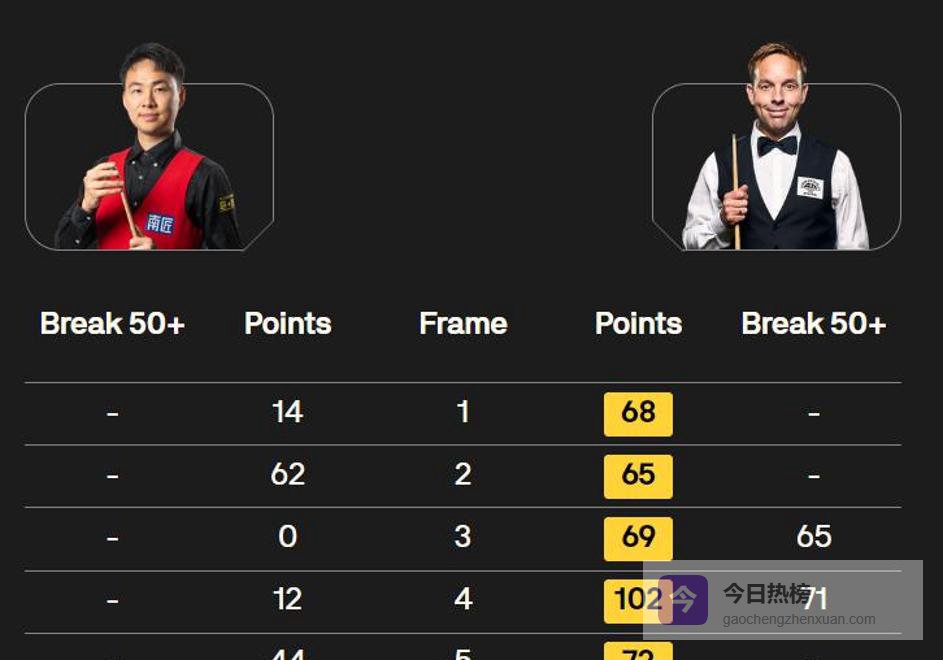 这次两人再次碰面,罗伯逊表现得非常出色,打出了1杆破百,还有4杆50+以上的得分。而查达这边,第二局和第五局直接一分都没拿到,其他三局虽然有机会,但都没能抓住,最终0比5被淘汰出局。