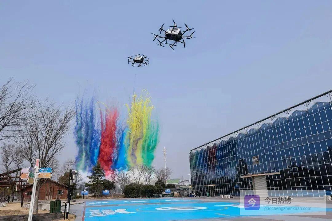 在祥源花世界景区里,两架亿航EH216-S 无人驾驶电动垂直起降航空器(eVTOL)原地腾空。