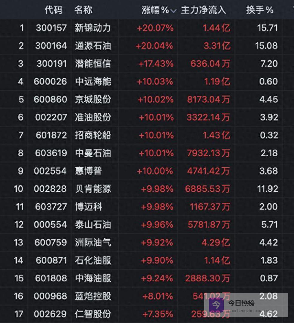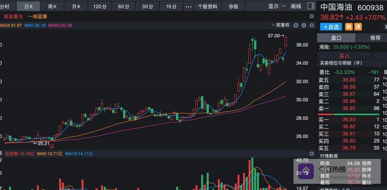 这场石油股狂欢中,最引人注目的无疑是“三桶油”的表现。中国海油股价在当天大涨超过7%,报收于36.94元,创下了自上市以来的历史新高。中国石油、中国石化也同步大幅上涨。这三家巨无霸央企的集体走强,不仅带动了整个油气板块的人气,更向市场释放了一个强烈的信号。在A股的历史经验中,“三桶油”的暴涨常常被视作市场风格切换的风向标,往往伴随着题材股炒作热情的退潮。