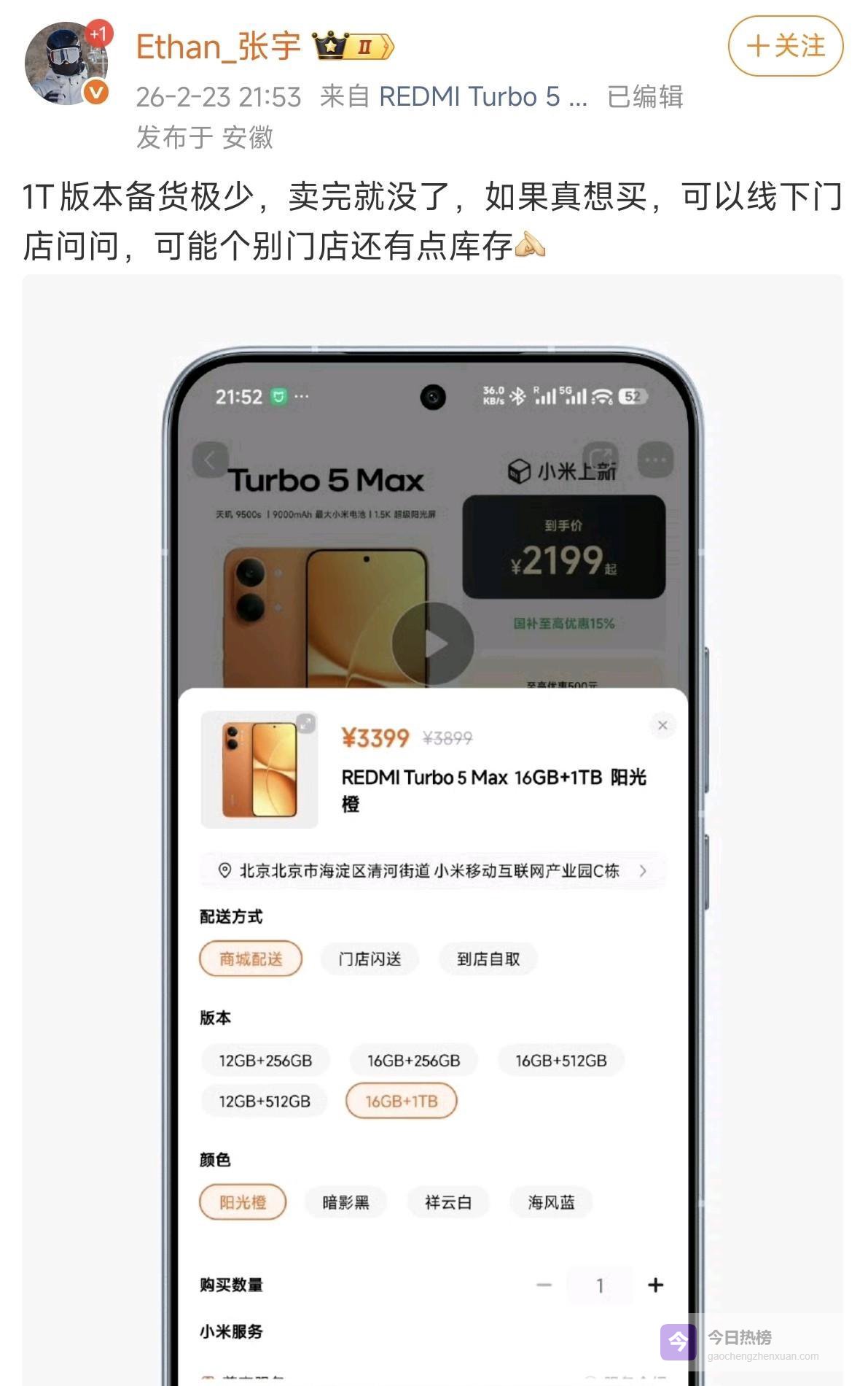 2026年2月24日,小米Redmi手机的市场经理张宇昨晚在社交平台上发了一条消息,专门回应了关于Redmi Turbo 5 Max 16GB+1TB版本的问题。他说:“1TB版本的货非常少,卖完就没了。如果真的想买,可以去线下门店问问,可能有些地方还剩几台。”