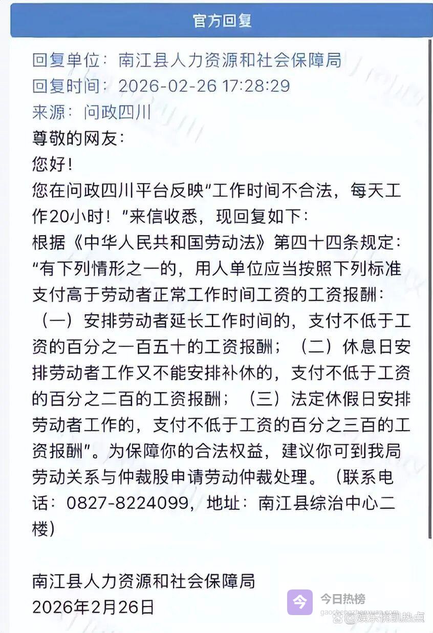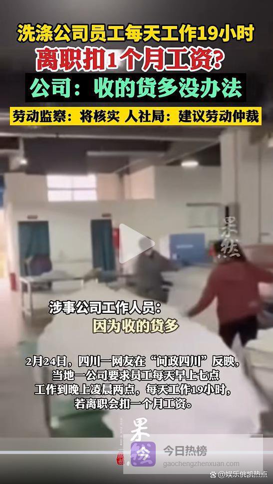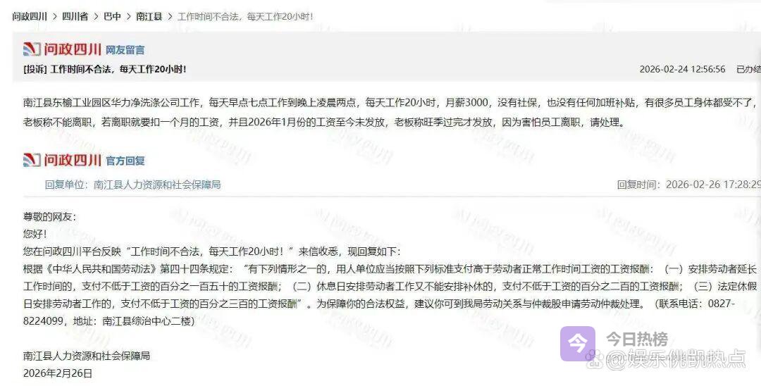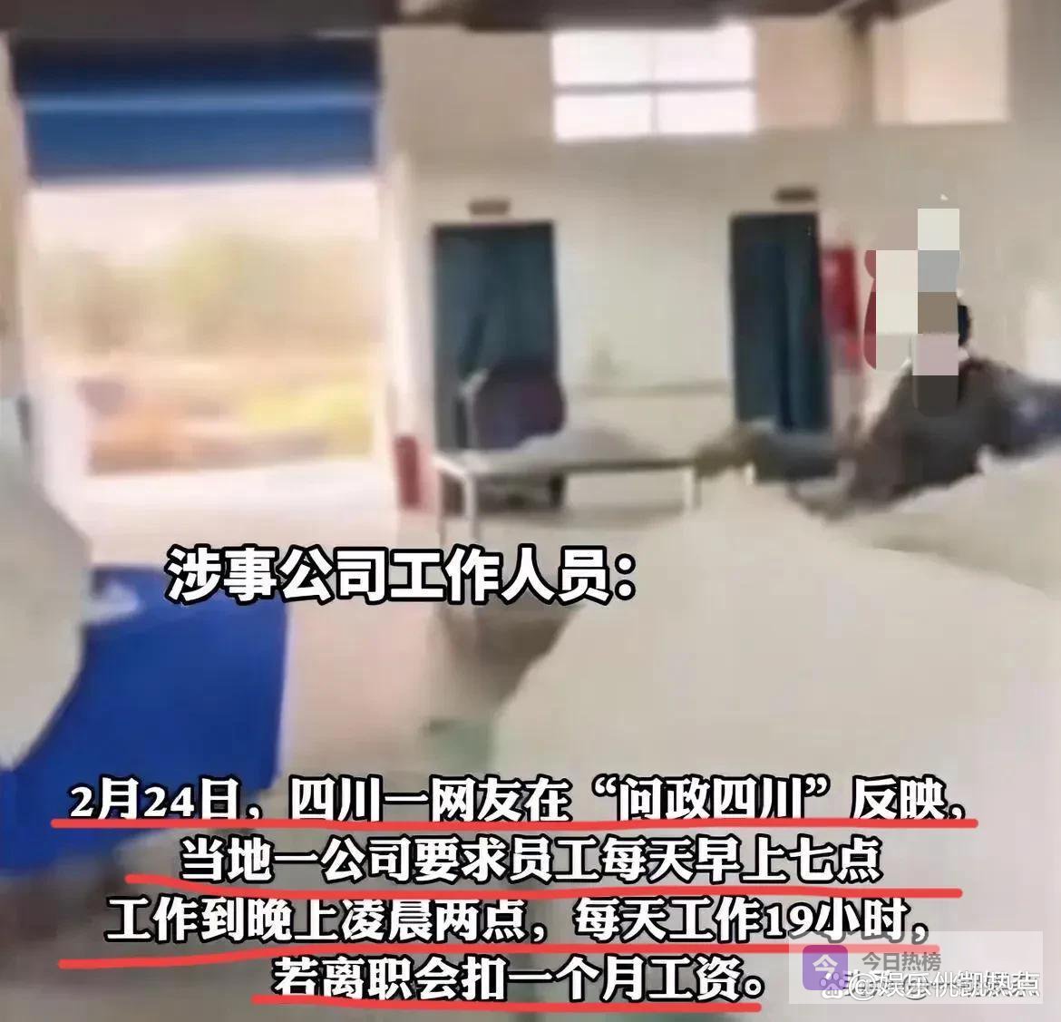 事情是2月24日在"问政四川"平台上被曝出来的,投诉内容一条一条都很具体:早七点上班到凌晨两点,一天19小时,月薪3000,零加班费,没社保,想辞职还得被扣一个月工资,1月份的工资到现在都没发。