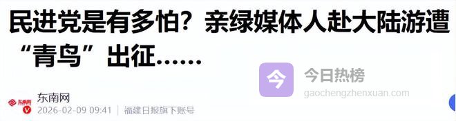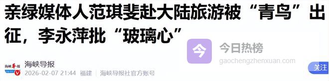 参考资料: 民进党是有多怕?亲绿媒体人赴大陆游遭“青鸟”出征……——东南网 亲绿媒体人范琪斐赴大陆旅游被“青鸟”出征,李永萍批“玻璃心”——海峡导报 岛内亲绿媒体人大赞成都,“青鸟”又破防——环球网