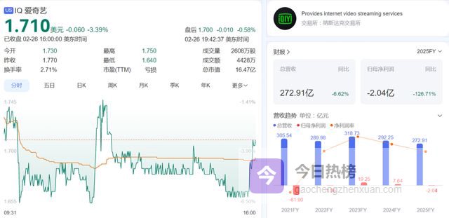 正所谓春江水暖鸭先知,业绩的“寒气”也第一时间传递到美股盘前,截至美东时间2月26日16:00(收盘),爱奇艺公司股价震荡下跌3.39%,报1.71美元,总市值16.47亿美元。