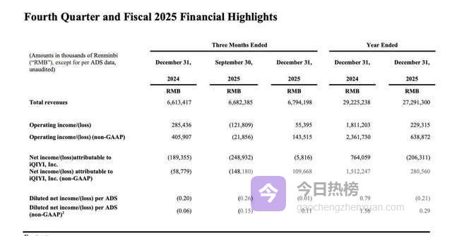 2月26日,爱奇艺披露了2025年第四季度及全年未经审计的财务业绩,报告显示,2025年全年爱奇艺总收入为272.9亿元人民币,较2024年同比下降7%,2025年全年基于非美国通用会计准则(Non-GAAP)运营利润为6.4亿元,较2024年的23.6亿元下滑约73%。