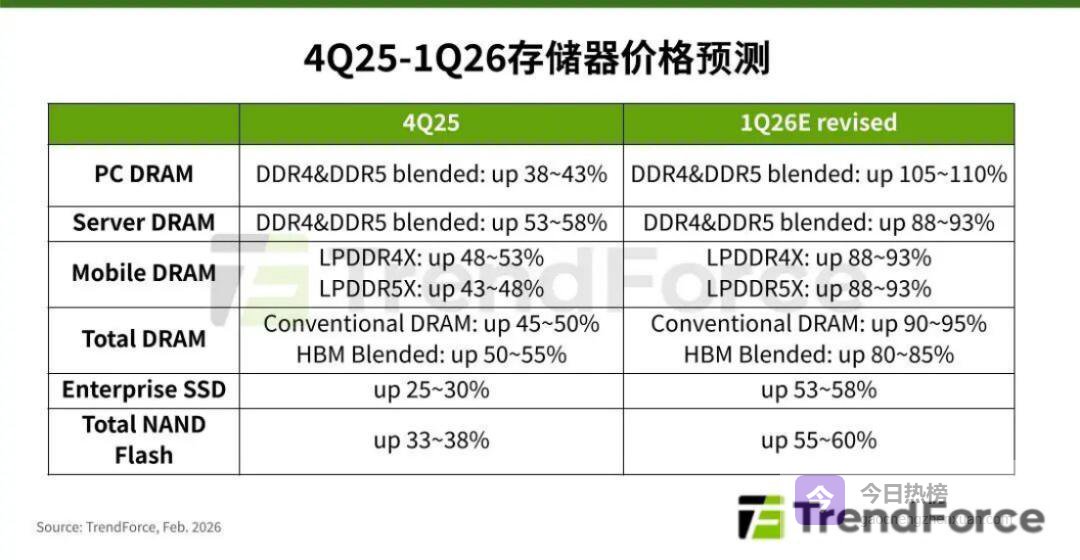 如今正处于存储超级周期,2026年第一季AI与数据中心需求持续加剧全球存储器供需失衡,原厂议价能力有增无减,TrendForce据此全面上修第一季DRAM、NAND Flash各产品价格季成长幅度,预估整体Conventional DRAM合约价将从一月初公布的季增55-60%,改为上涨90-95%,NAND Flash合约价则从季增33-38%上调至55-60%,并且不排除仍有进一步上修空间。