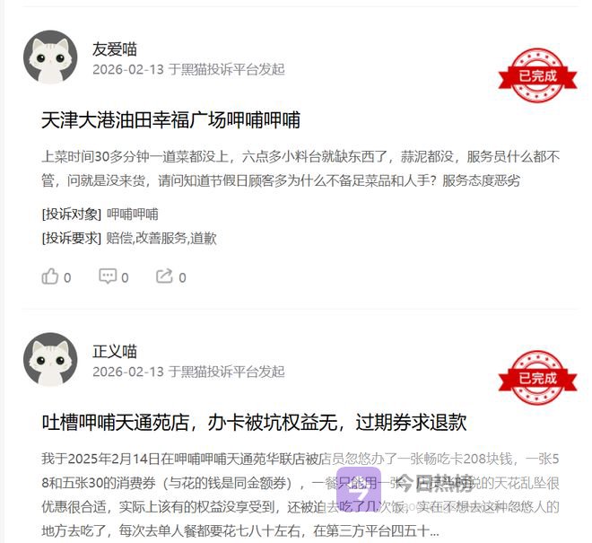 而打开黑猫投诉平台,关于呷哺呷哺外卖服务、涉嫌消费欺诈的投诉,也是屡见不鲜。此外,关于门店缺小料、坐等半小时没有上菜、服务员形同虚设不管不问等的服务投诉也并不罕见。