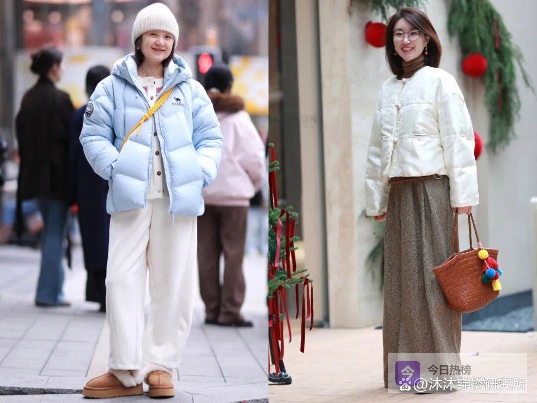比如说,你可以像上方图左那位姐妹一样,穿一件淡绿色的羽绒服,下搭一条咖色的阔腿裤。配色超级经典,很显高级。