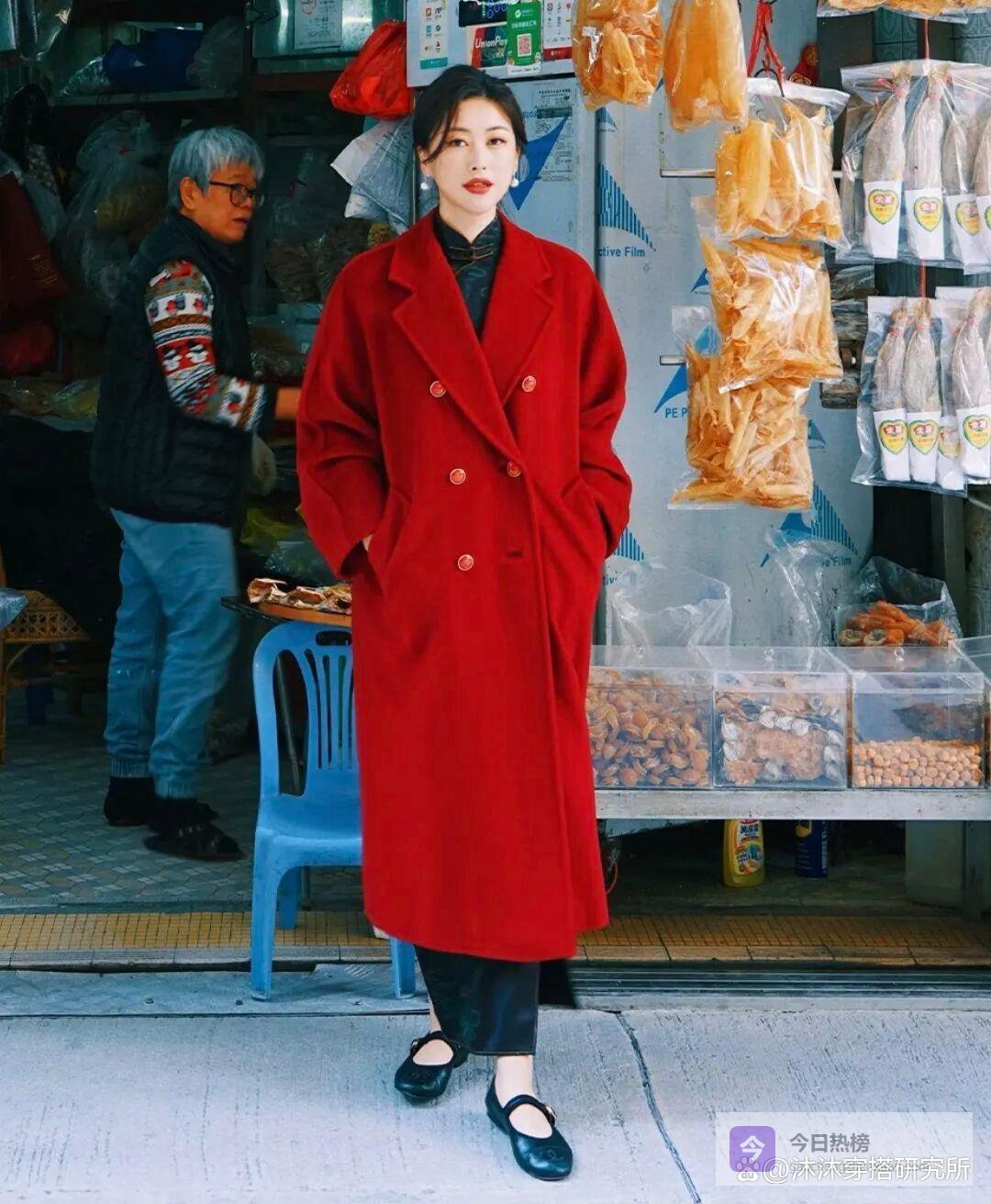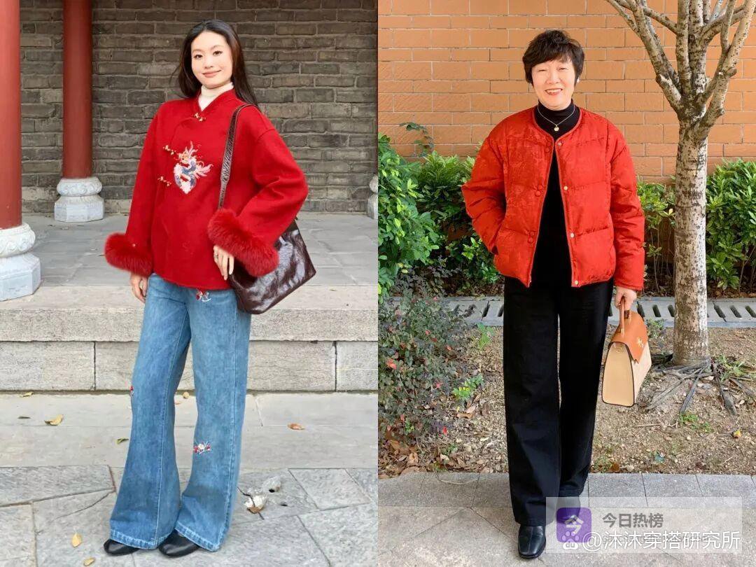 想穿得喜庆点的姐妹,你就可以选一件红色的新中式外套,上面可以带点小刺绣或小图案的设计,年味一下子就更浓了。