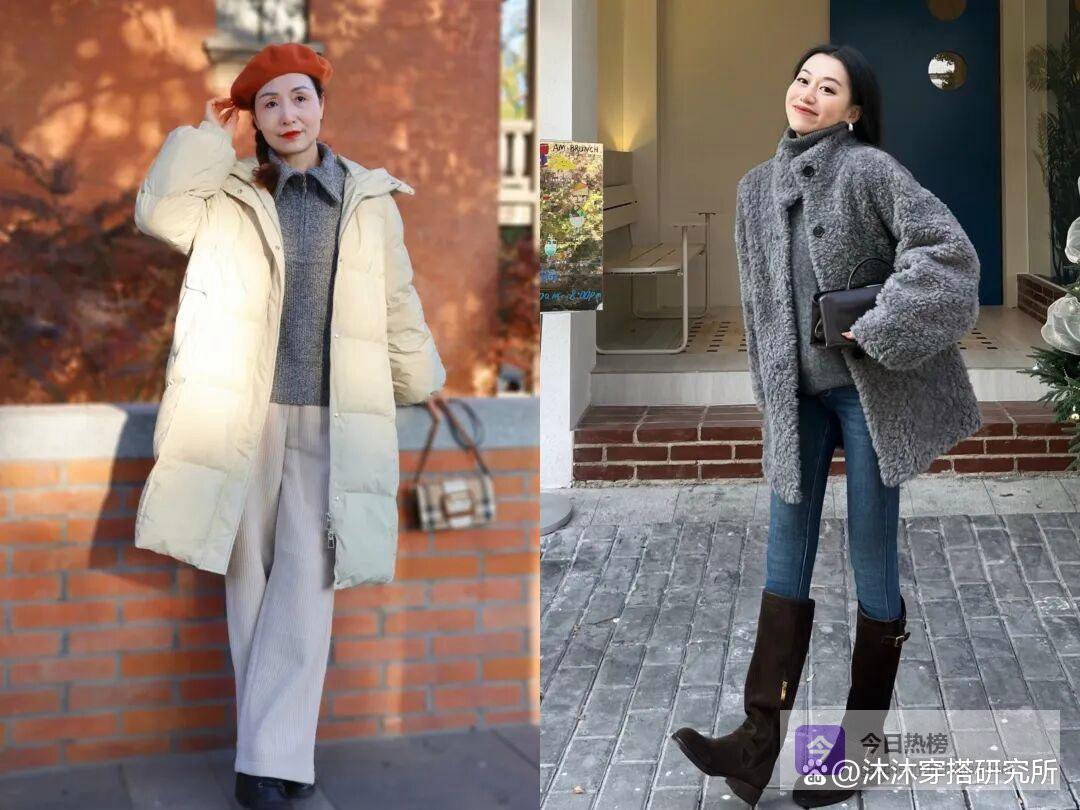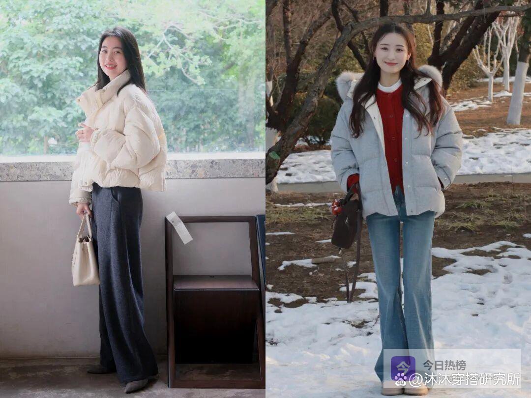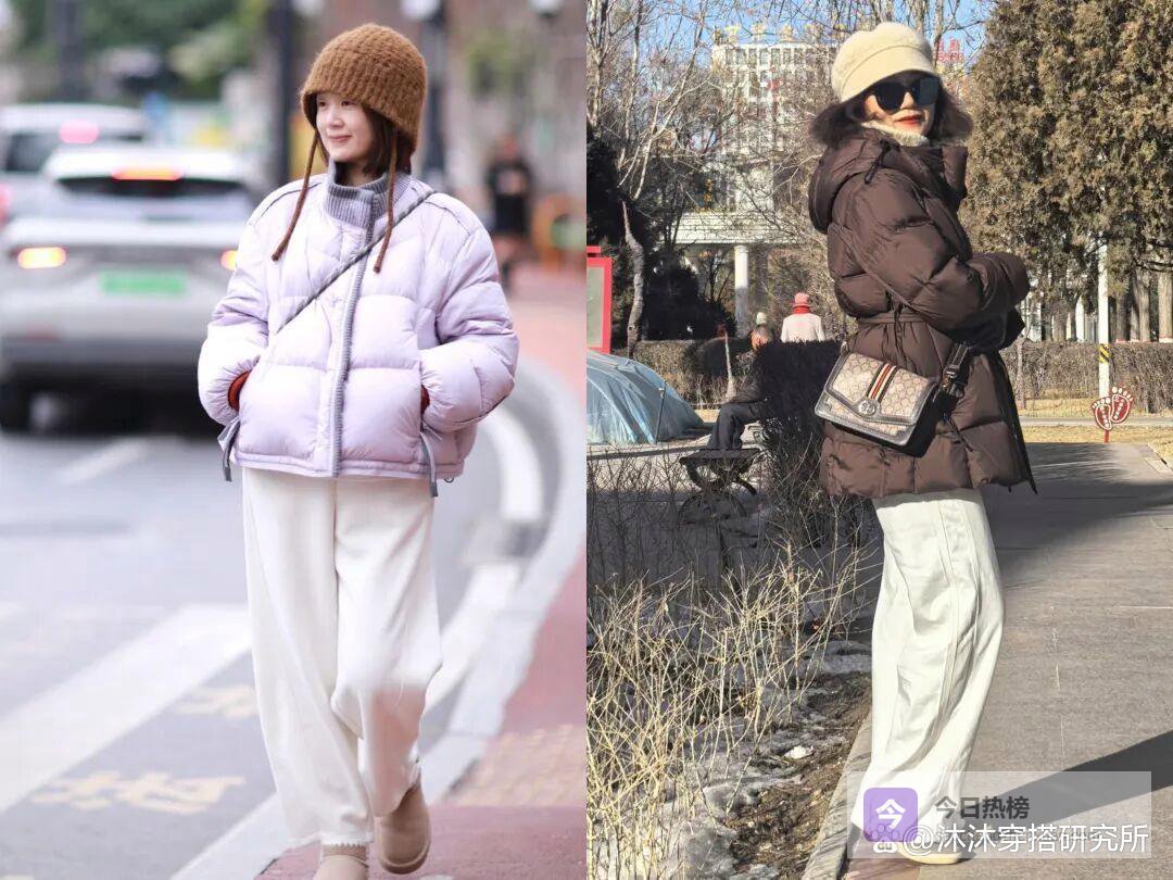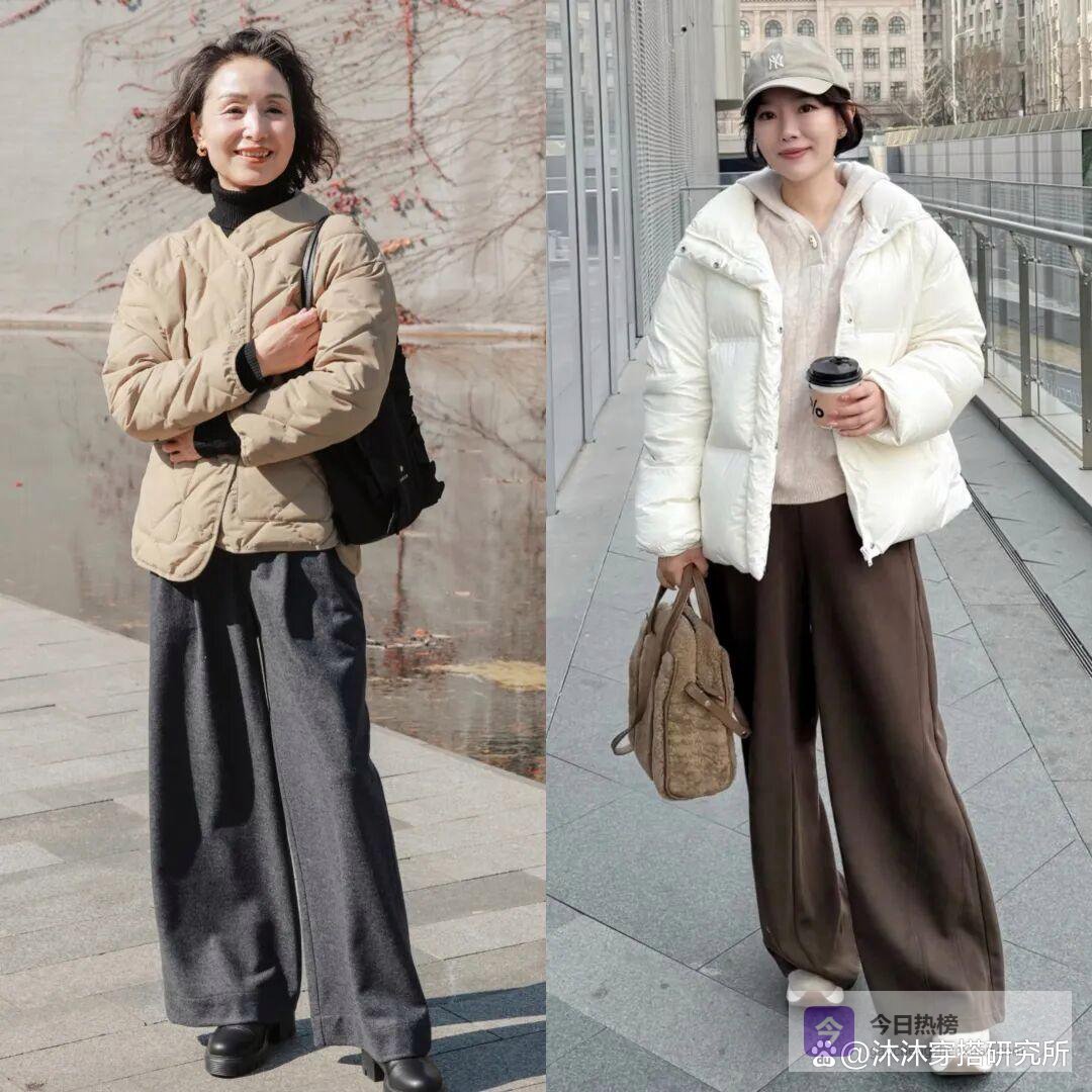 像羽绒服配阔腿裤就是一个非常不错的选择,一定要选择垂感好、线条利落的版型。