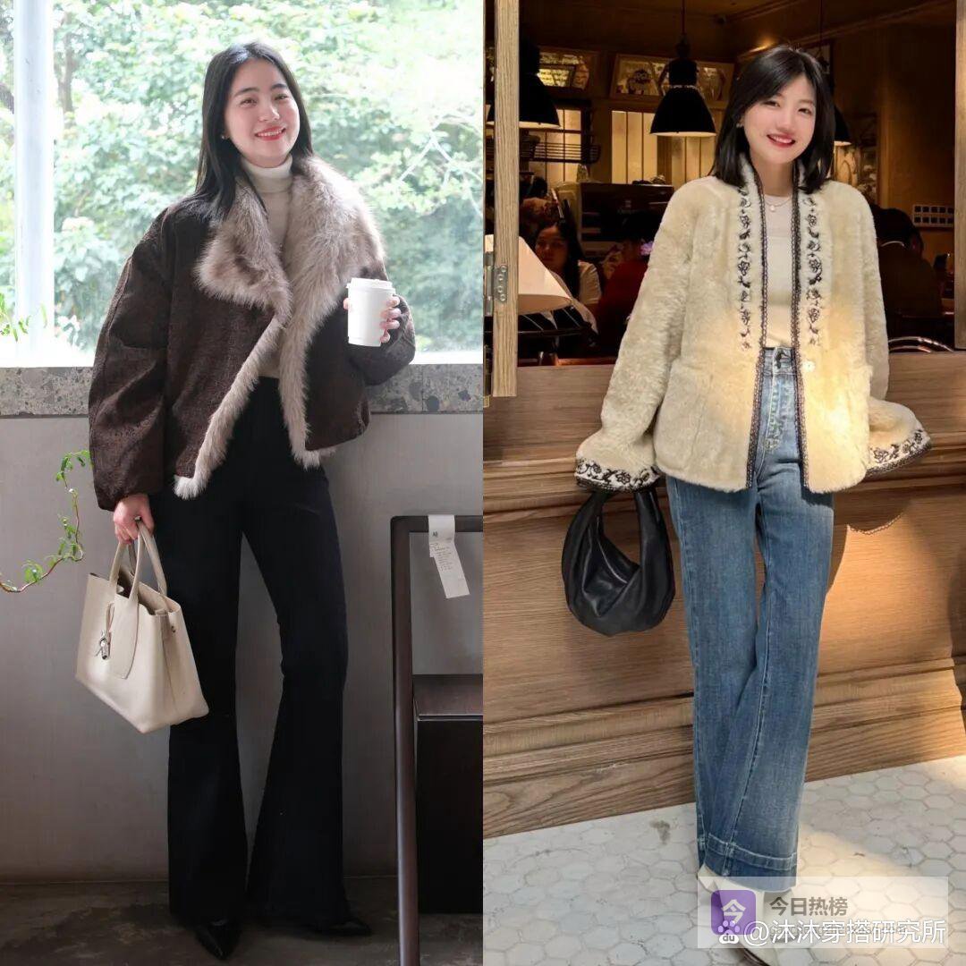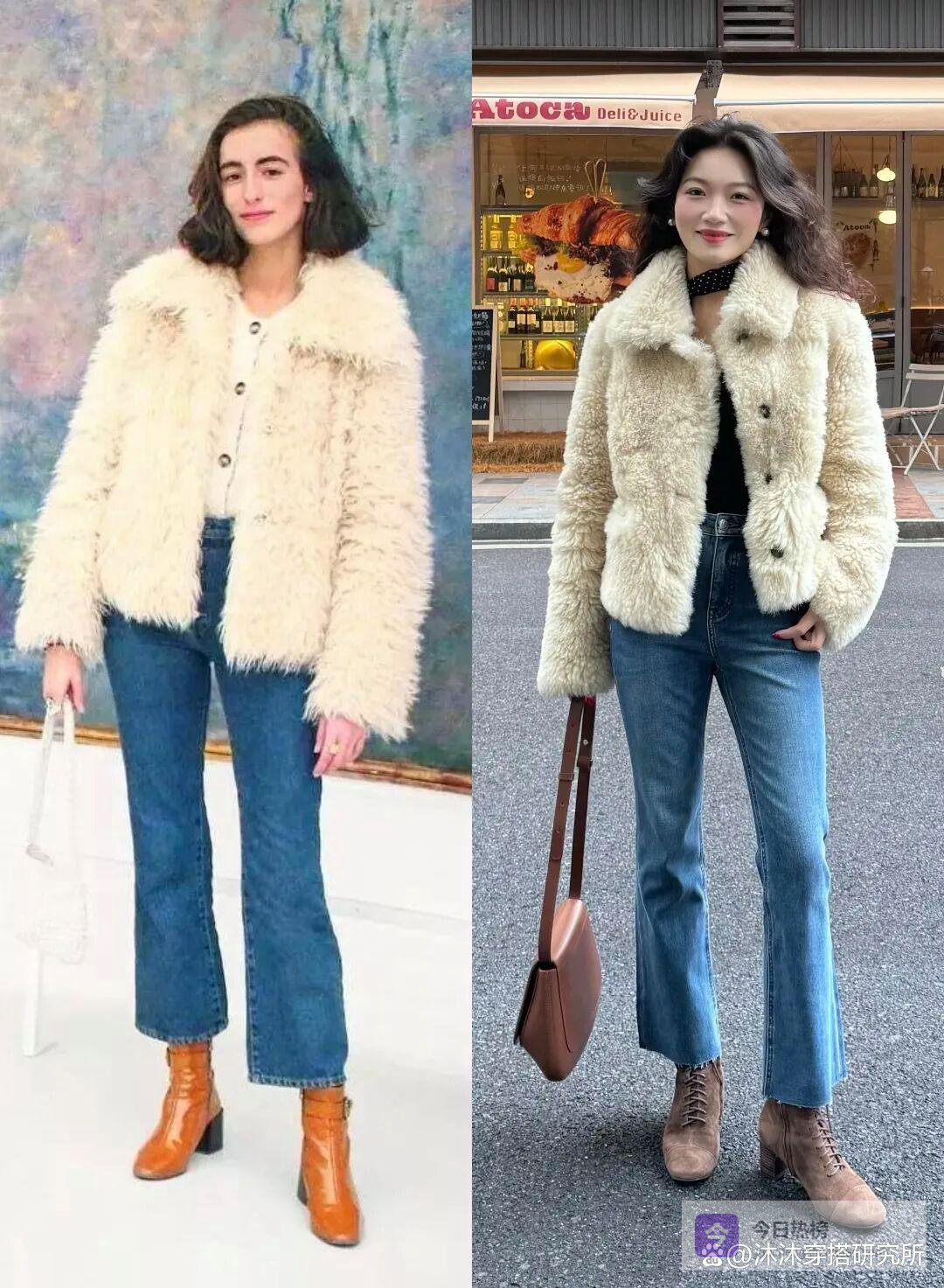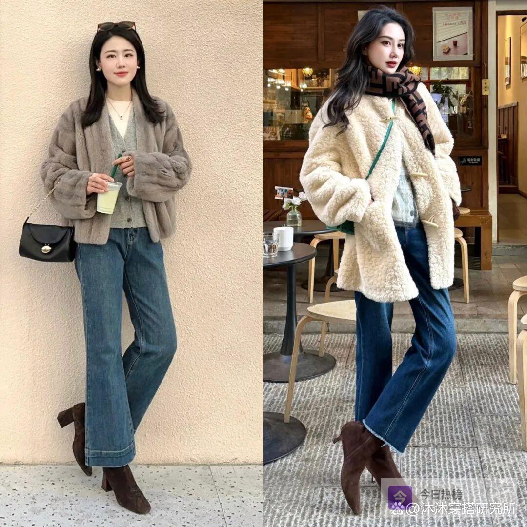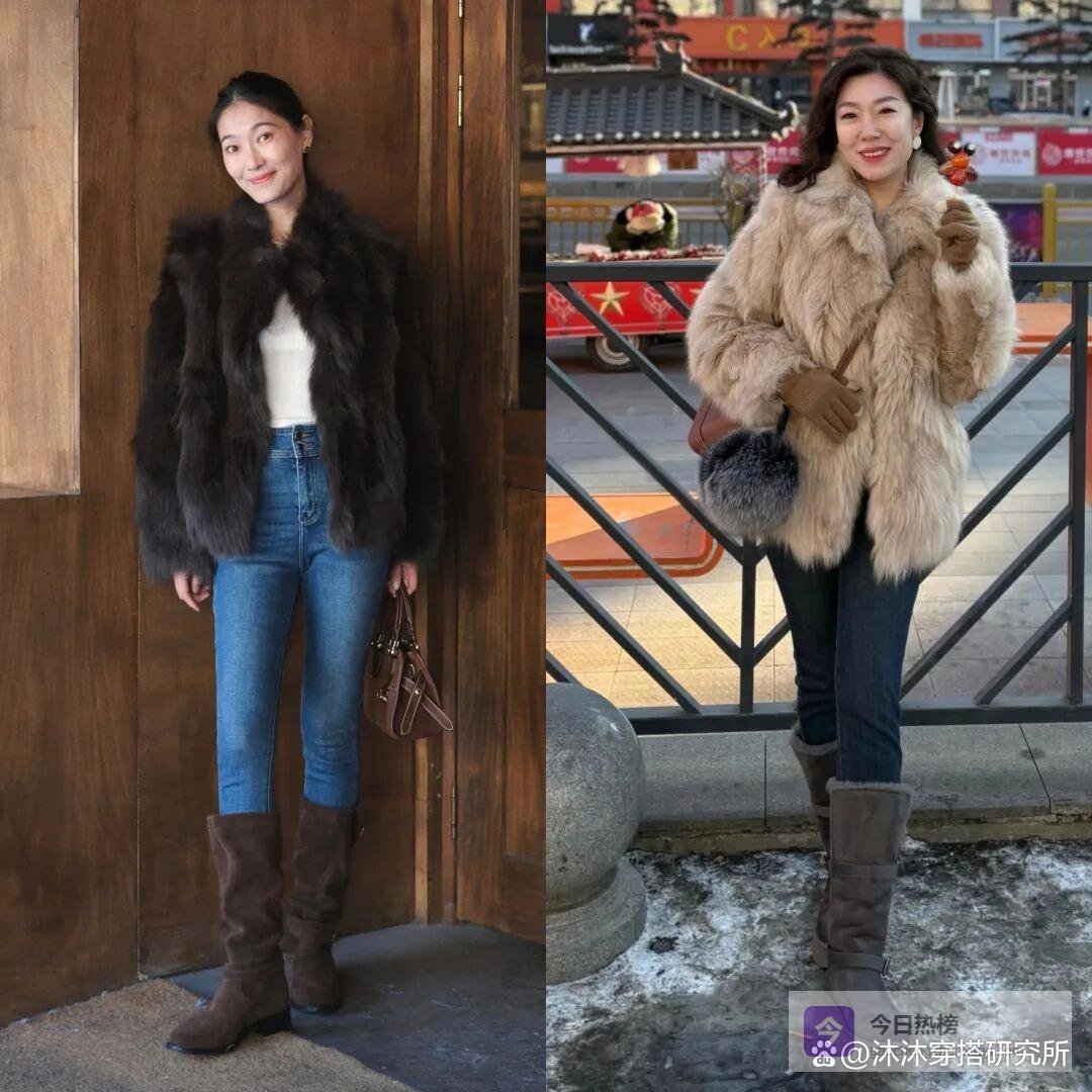 一般情况下呢,皮草外套搭配靴子的时候,有两种比较常见的穿搭方式。