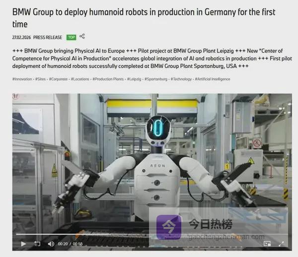 2月27日,宝马集团宣布了一项具有里程碑意义的试点计划:将在其德国莱比锡工厂部署人形机器人,这是宝马首次在欧洲生产体系中引入此类基于人工智能的机器人技术。