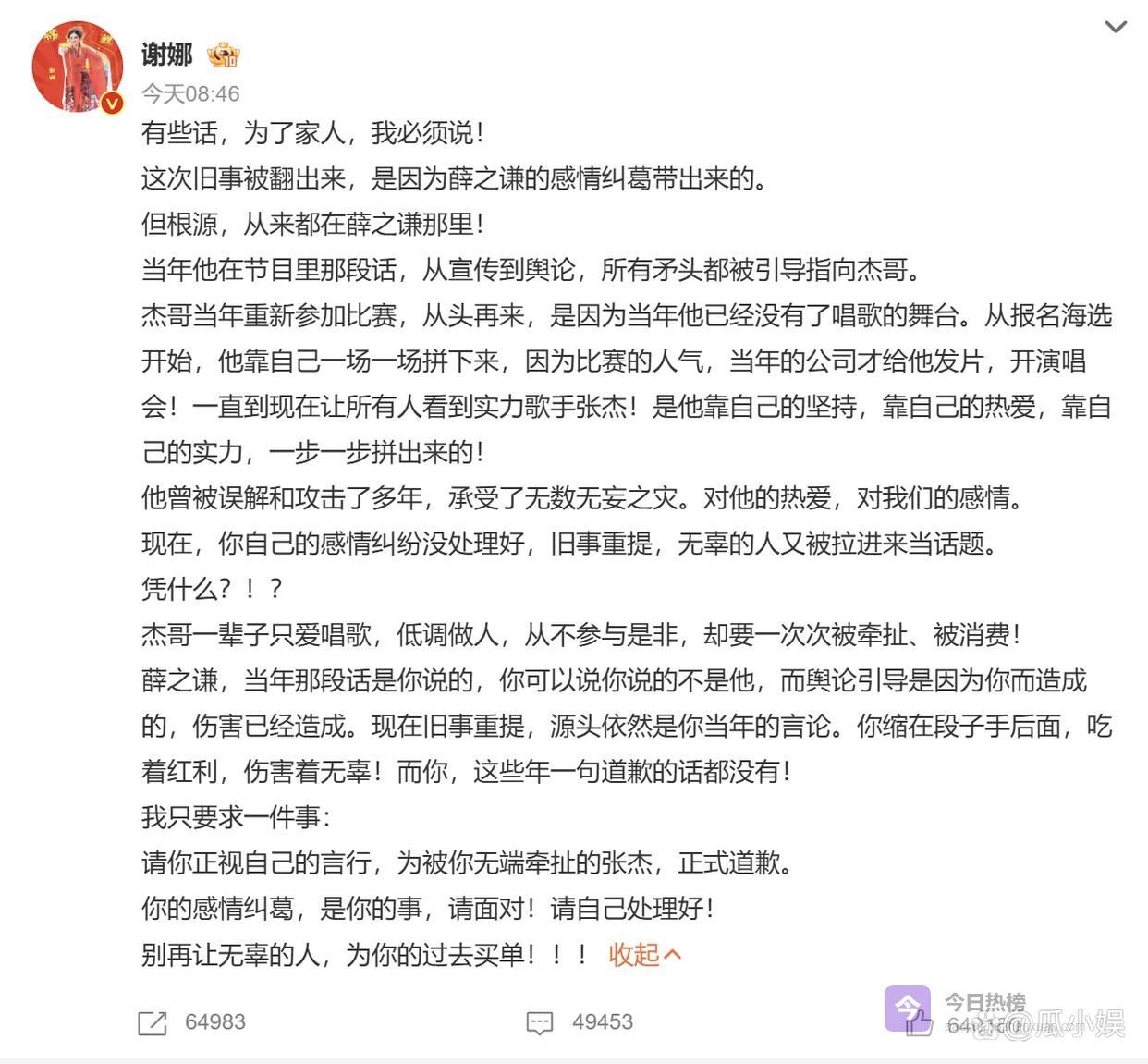 让薛之谦正视自己的言行,为无端牵扯张杰正式道歉。