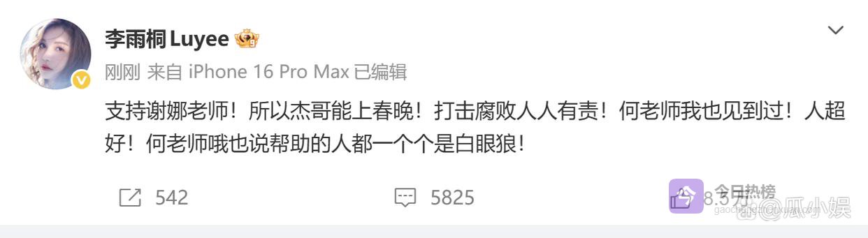 还有人说,谢娜这时候出来说话,是在帮李雨桐转移视线。