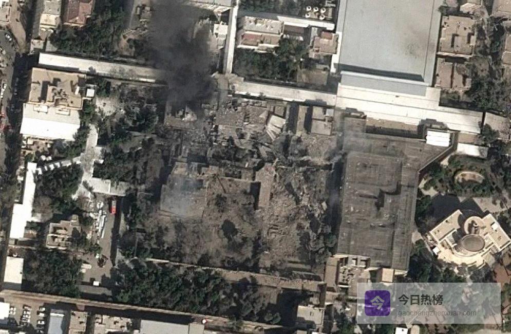 多个画面显示哈梅内伊办公区及周边遭到精准打击,浓烟在院墙上方久久不散