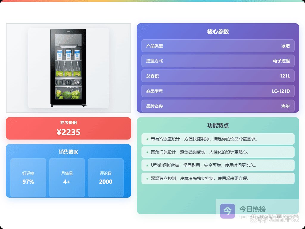 第1款:海尔LC-121D特点:121L容量、双温区独立控温、钢化玻璃门