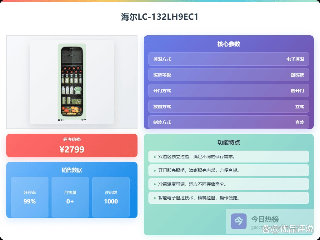第2款:海尔LC-132LH9EC1特点:双温区独立控温、99.9%抗菌、纤薄美观