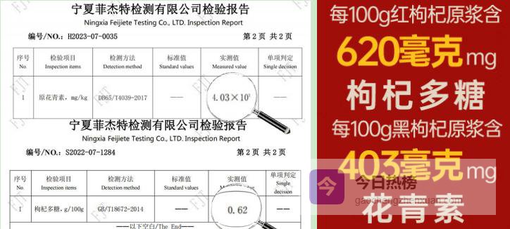 它凭什么脱颖而出?产地硬核:黑枸杞来自青海,红枸杞来自宁夏中宁,黄金产区强强联合。含量碾压:经谱尼测试认证,黑枸杞原浆花青素高达403mg/100g,是蓝莓的22倍;红枸杞原浆枸杞多糖620mg/100g,超国标55%,每袋浓缩约300颗枸杞精华。配料纯粹:只有红枸杞原汁、黑枸杞原汁,分开装更保鲜。