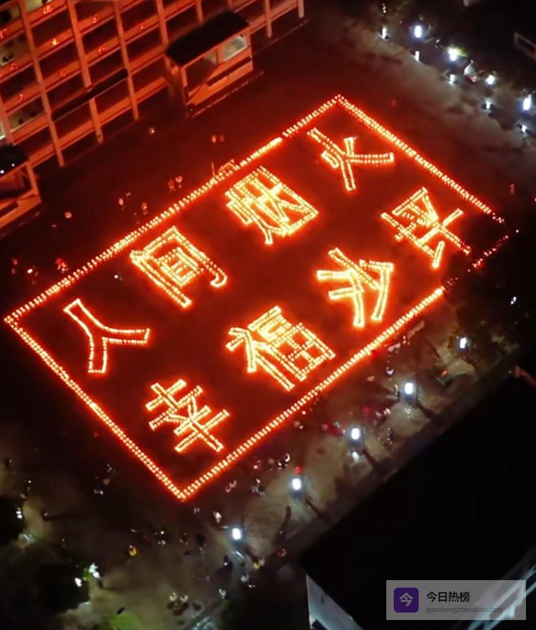 最动人的场景在操场:学生用数百根蜡烛拼出“人间烟火 幸福沙坪”八个字,电光石火间,八个字被点亮,也把整个夜空烫出一个小洞,让孩子们看见自己写下的愿望。