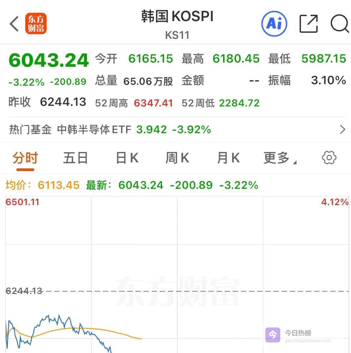 韩国综指更惨——因为前一天休市,今天直接跳空低开1.35%,开盘半小时后掉头向下,跌幅迅速扩大到3.65%。
