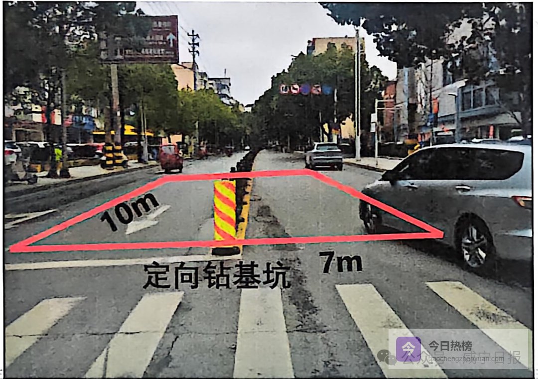 长安大道:现状机动车道为14m宽双向4车道,路中设有隔离护栏。施工打围占现状两车道,工作坑及井室位置定点打围,由东向西仍保留一车道通行。现状交通组织路线不变,道路变窄处增加变道提醒标识。