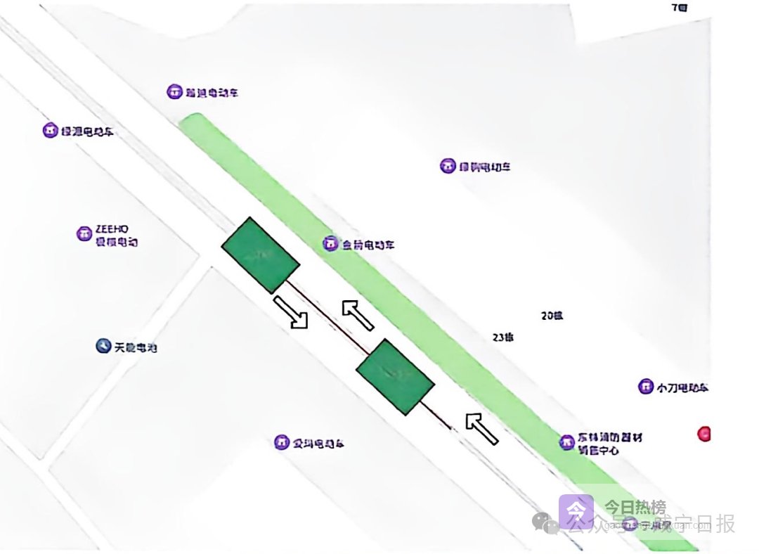 永安大道:现状机动车道为21.5m宽双向6车道,路中设置隔离护栏。施工打围占现状两车道,由南向北仍保留一车道通行。现状交通组织路线不变,道路变窄处增加变道提醒标识。