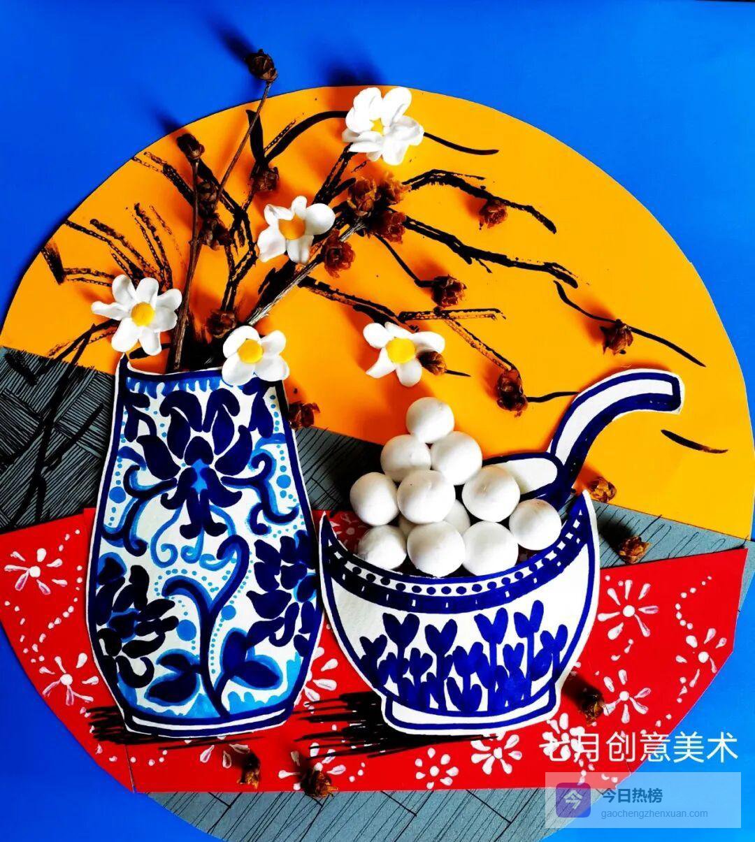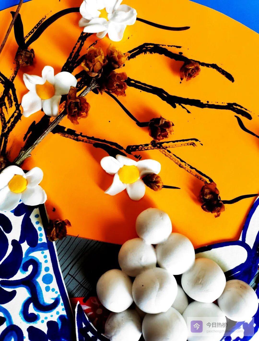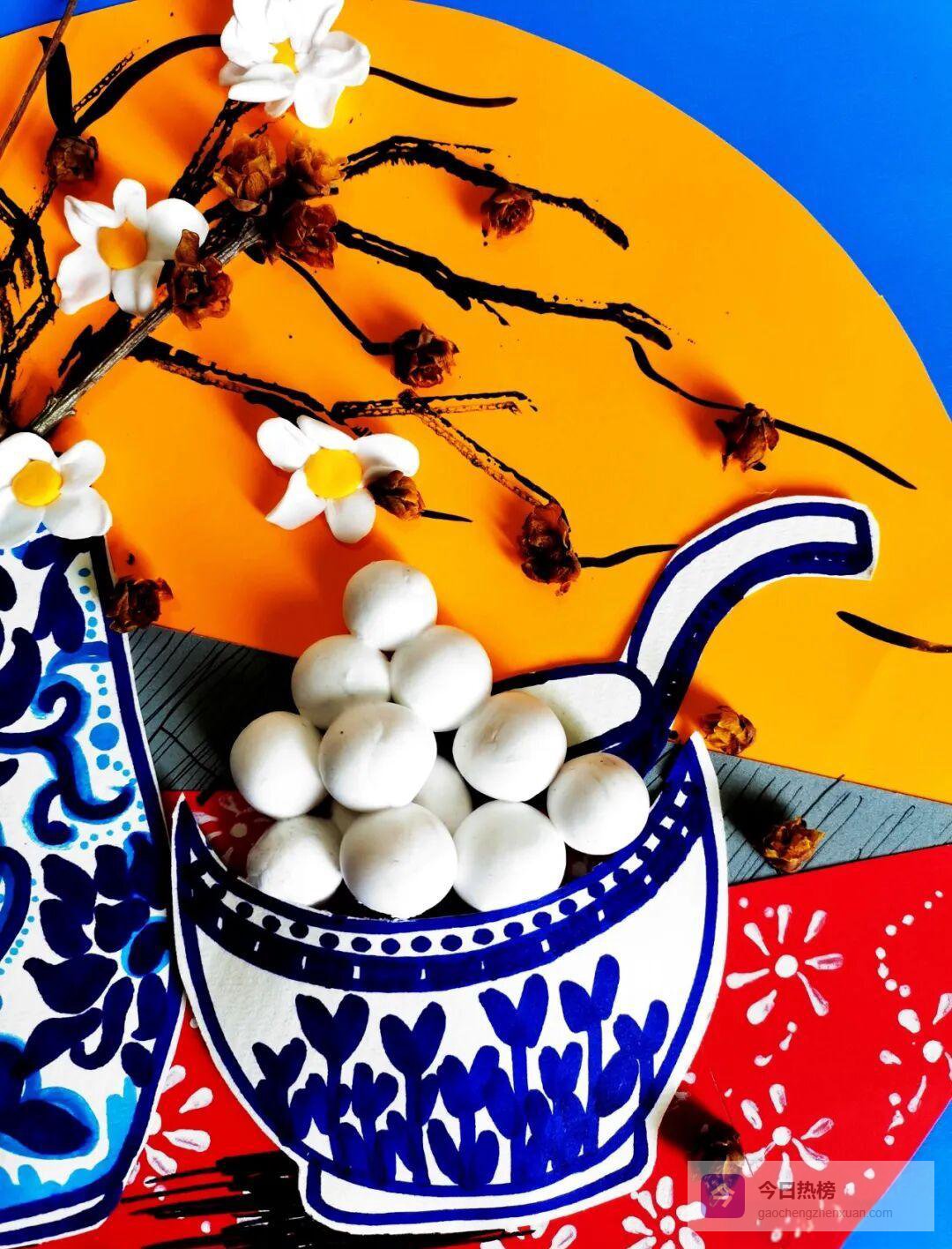 彩色卡纸、蓝色水彩笔、超轻黏土、勾线笔、修正液、干花、树枝……准备这些材料,就能把诗里的元宵搬到桌面。
