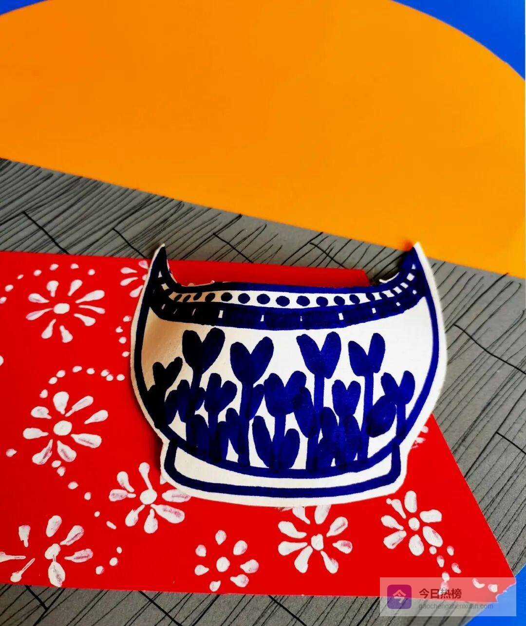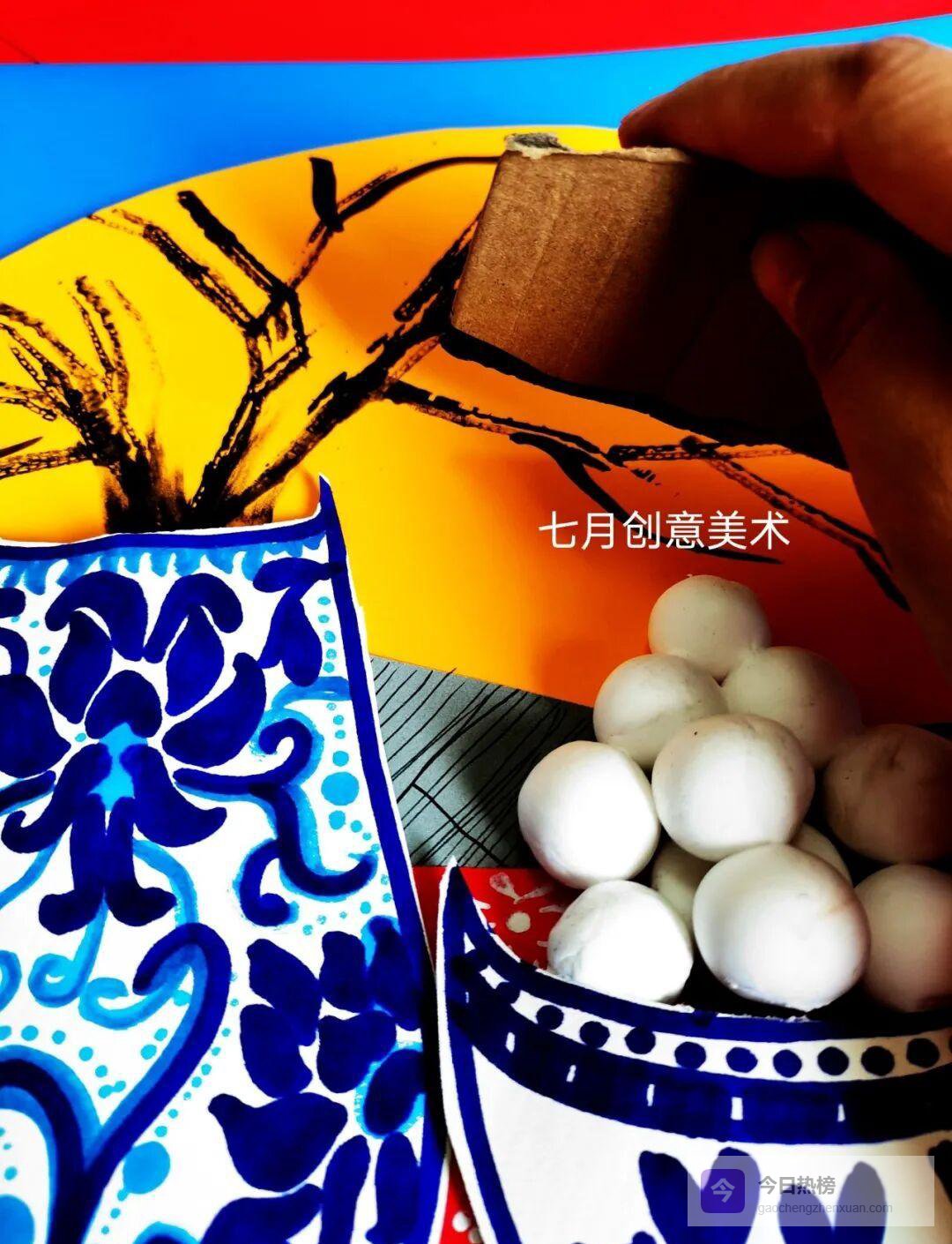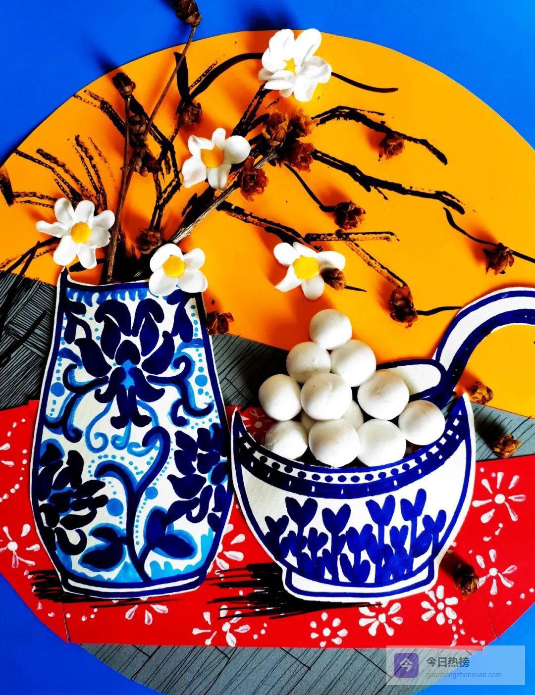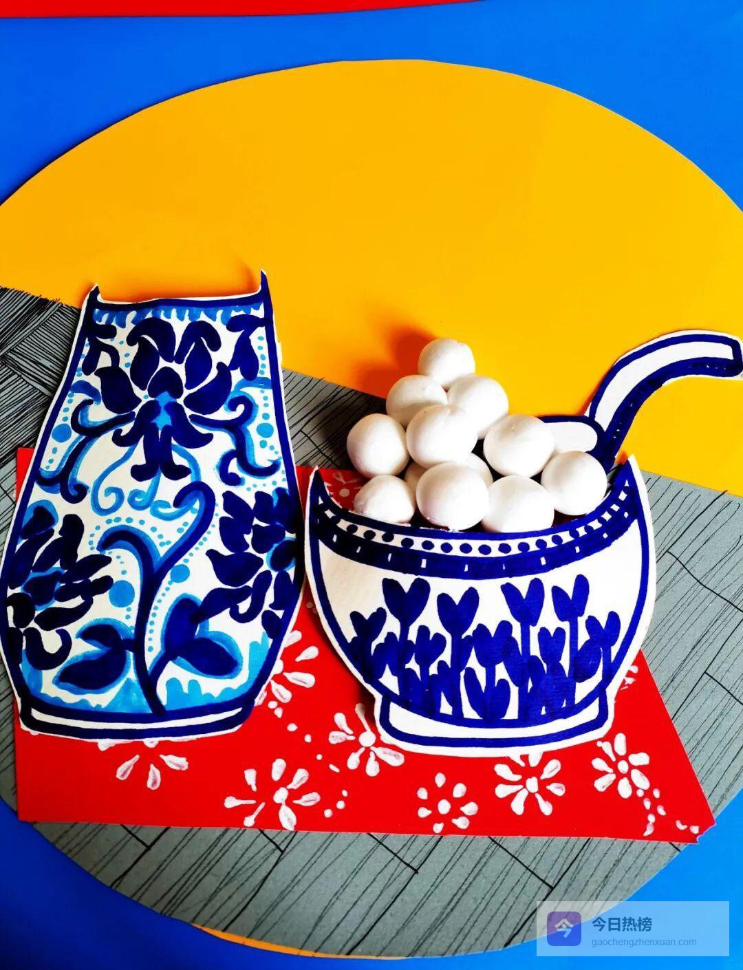 ③ 在白色卡纸上画出碗沿与花瓶轮廓,注意花纹配色呼应;接着用黏土捏出软萌汤圆,压出小窝窝,像极了刚煮好的样子。