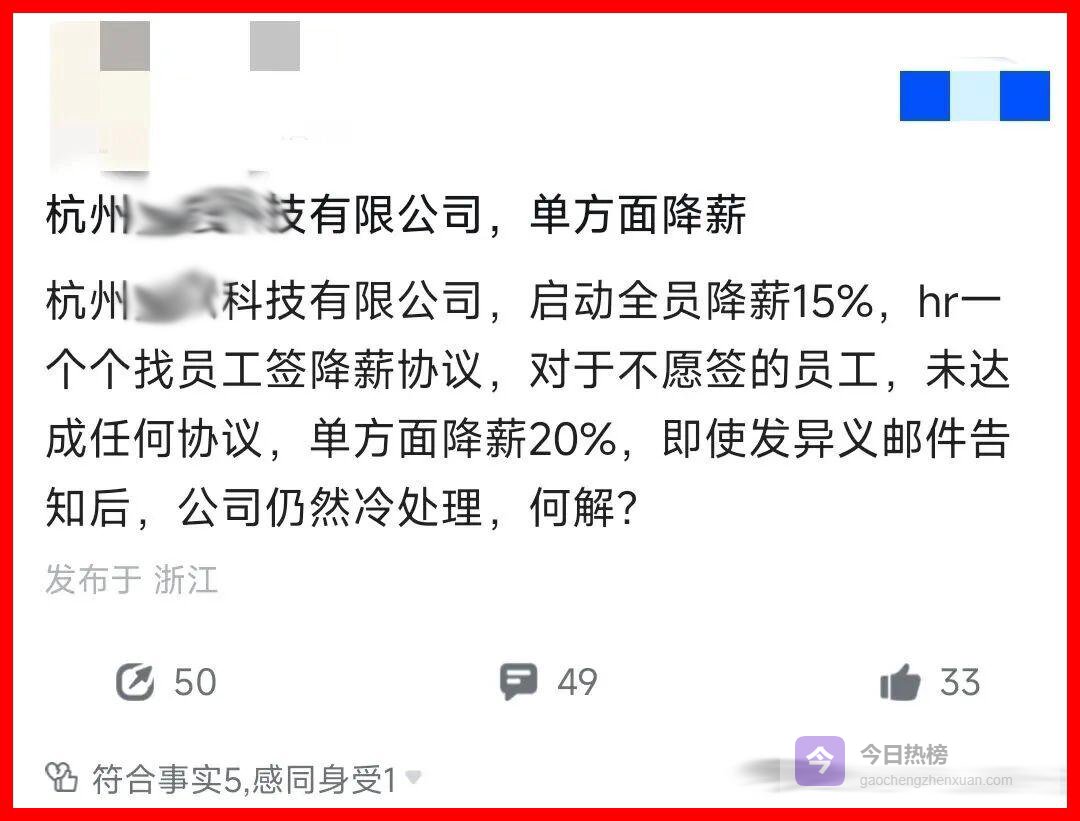 然而,近日杭州一科技公司被曝出的降薪操作,依然刺痛了公众的神经。据爆料,这家曾被视为网络安全赛道上“明星”的企业,正在以一种近乎冷酷且极具争议的方式,与自己的员工进行一场不平等的博弈:全员降薪15%,HR逐个约谈;对于不愿签字的“刺头”,公司直接祭出单方面降薪20%的重拳。面对员工的邮件异议,公司选择了最傲慢的应对方式——冷处理。