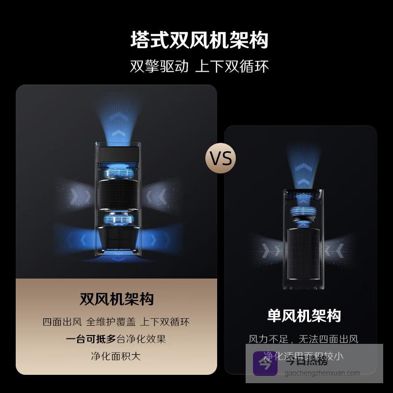 重构塔式设计:采用创新的塔式双风机架构,实现全面的上下双循环覆盖,有效提升室内空气净化能力。