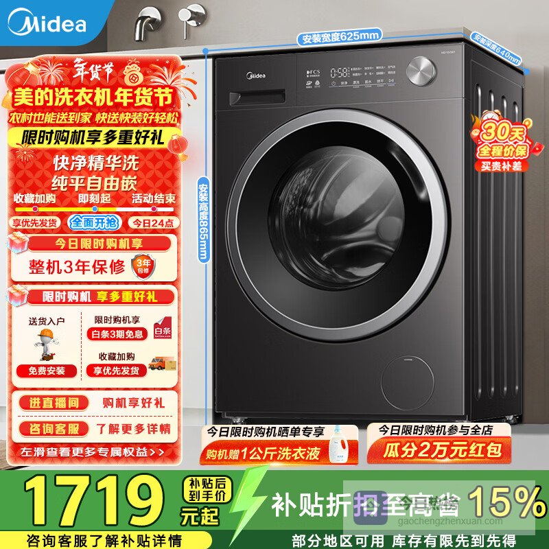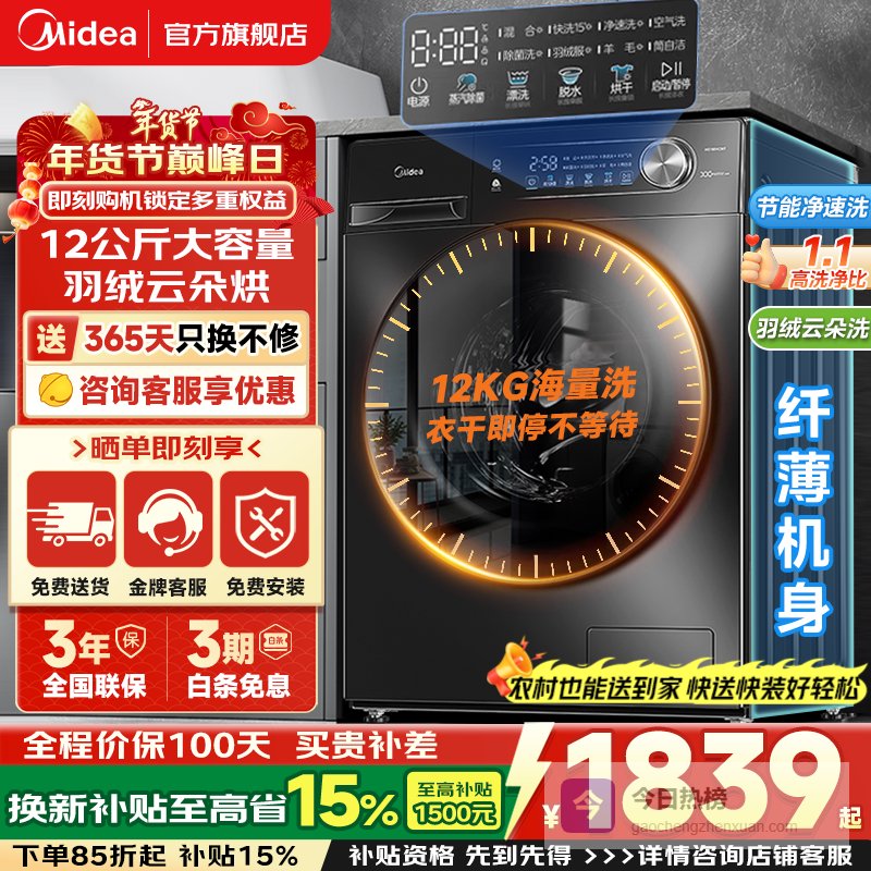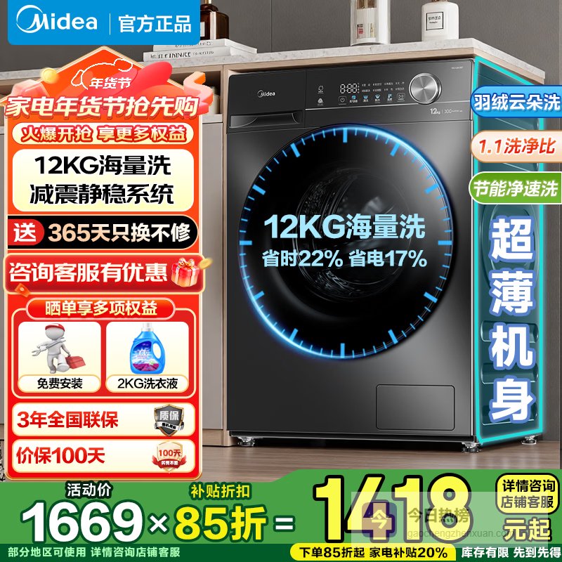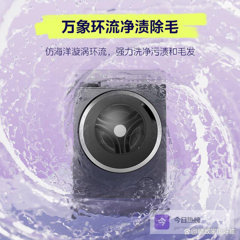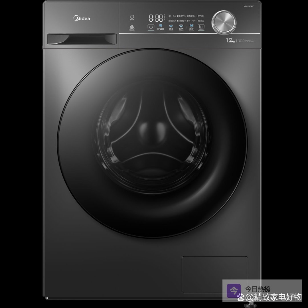 4、美的12KG洗衣机这款美的洗衣机在洁净方面下了功夫,1.10的高洗净比,能更有效地去除顽固污渍,像孩子衣服上的常见污渍也能搞定。万象环流净涤,还能去除衣物上的毛絮,洗完就像新的一样,真是省心!而且它还很会“省”,节能净速洗模式,省水省电不在话下。