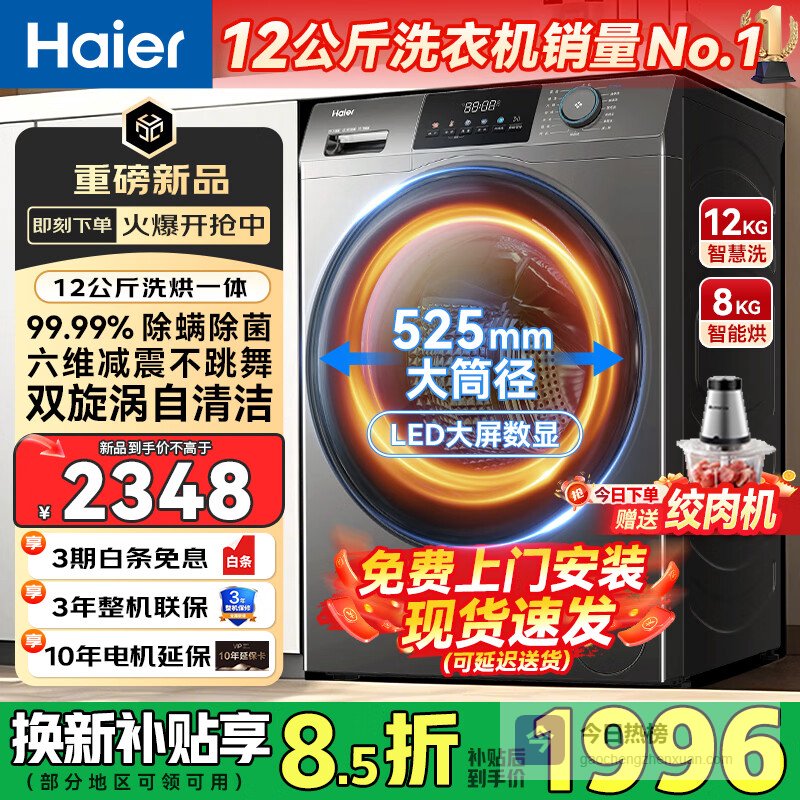1、海尔12公斤洗烘一体这款洗烘一体机,拥有12公斤洗涤和8/9公斤烘干大容量,一次性能搞定不少衣物,搭配525mm大筒径,让衣物舒展自如,洗得更干净,烘得更蓬松。更贴心的是,它还有多种洗涤模式,无论是羊毛、羽绒还是内衣,都能找到合适的洗护方案,省心多了!